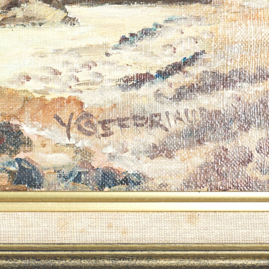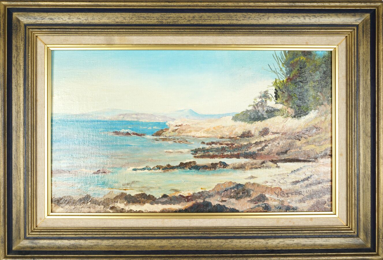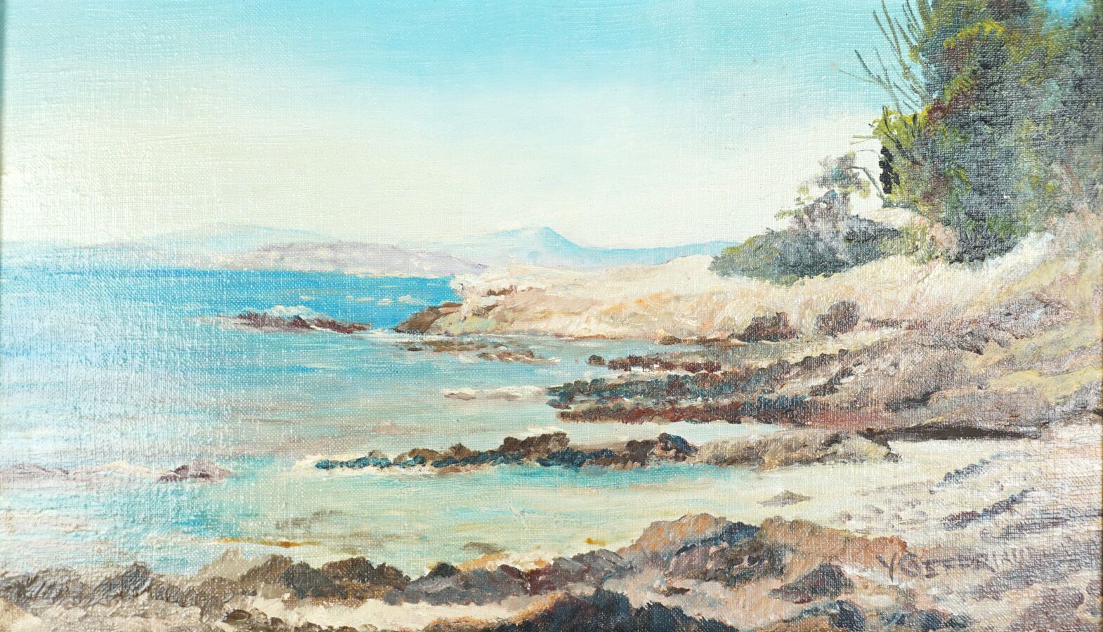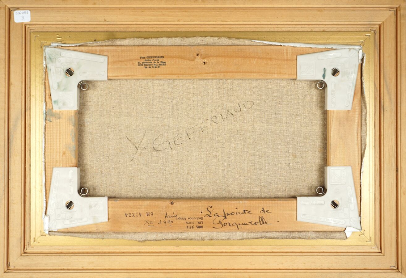 Yves GEFFRIAUD (XXe) "La pointe de Porquerolle" 1990, huile sur toile, signée en bas à droite, contresignée, titrée et datée au dos, 24 x 41 cm.