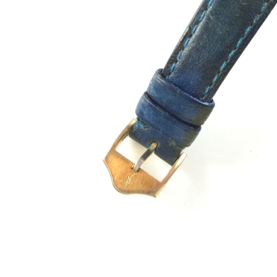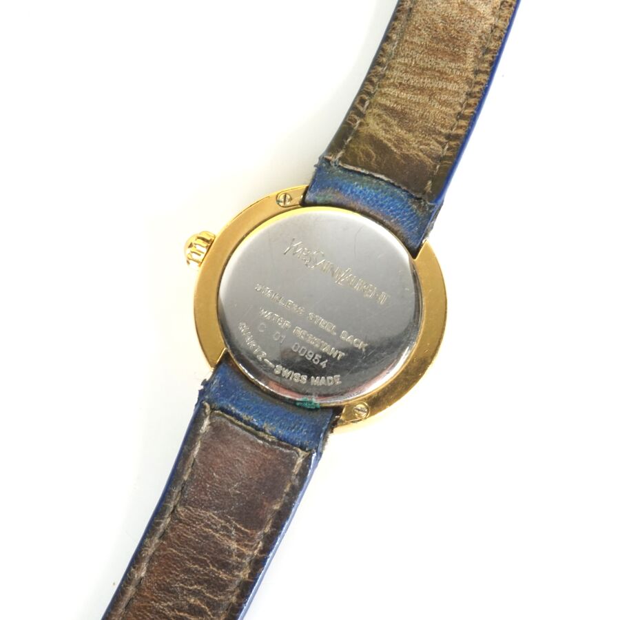 YVES SAINT-LAURENT : Montre bracelet de dame, boîtier rond en métal doré et acier à motif rainuré, fond beige et bleu logoté, chiffres arabes pour les quatre heures et puces appliquées, guichet dateur à 3H, mouvement à quartz, fond vissé numéroté, bracelet en cuir bleu, boucle ardillon en métal doré logoté, Diam. Boîtier : 2.7 cm. L. Totale : 20.8 cm (usures au bracelet).