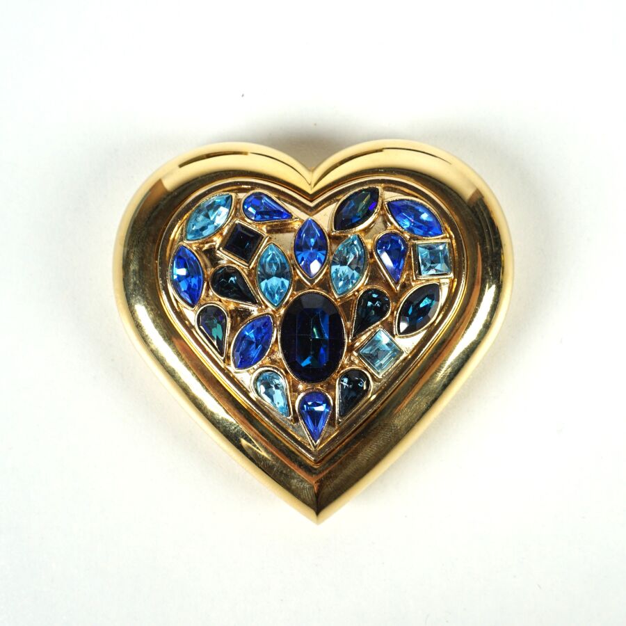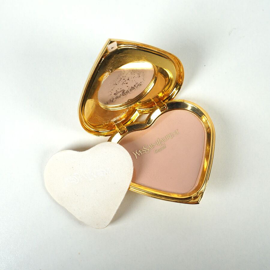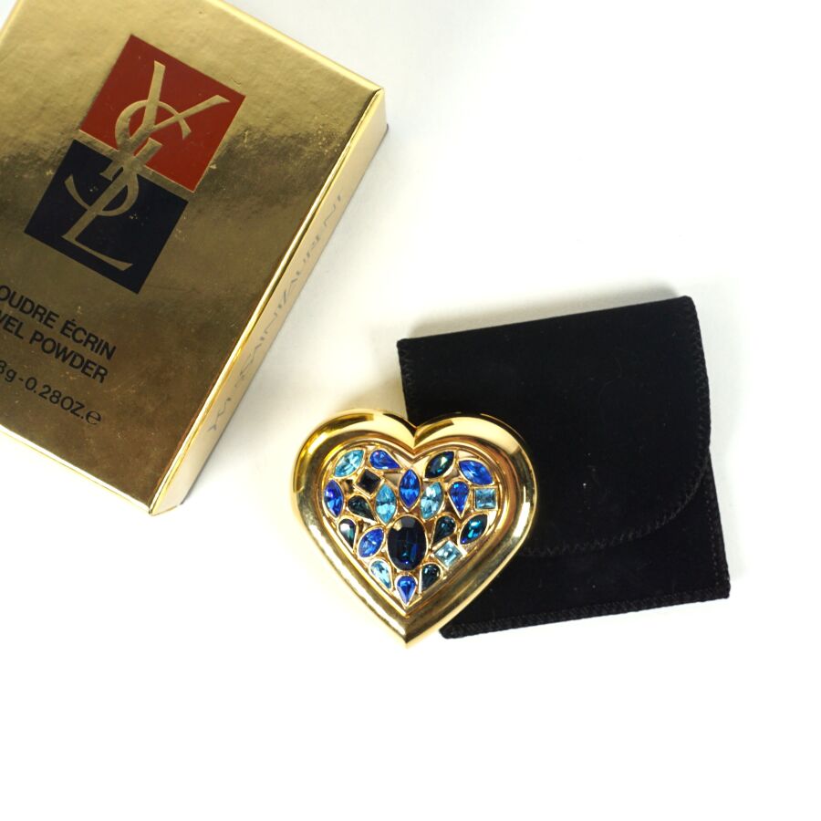 YVES SAINT-LAURENT : Poudrier "coeur" en métal doré et verroterie colorée, intérieur complet de sa poudre, sa houppette et son miroir, signé en creux au dos et portant l'étiquette "Poudre écrin jewel powder 8g - 0.28OZ. 73061 - 7", présenté avec sa housse et son boîte d'origine, 7 x 7 cm (houppette en l'état).