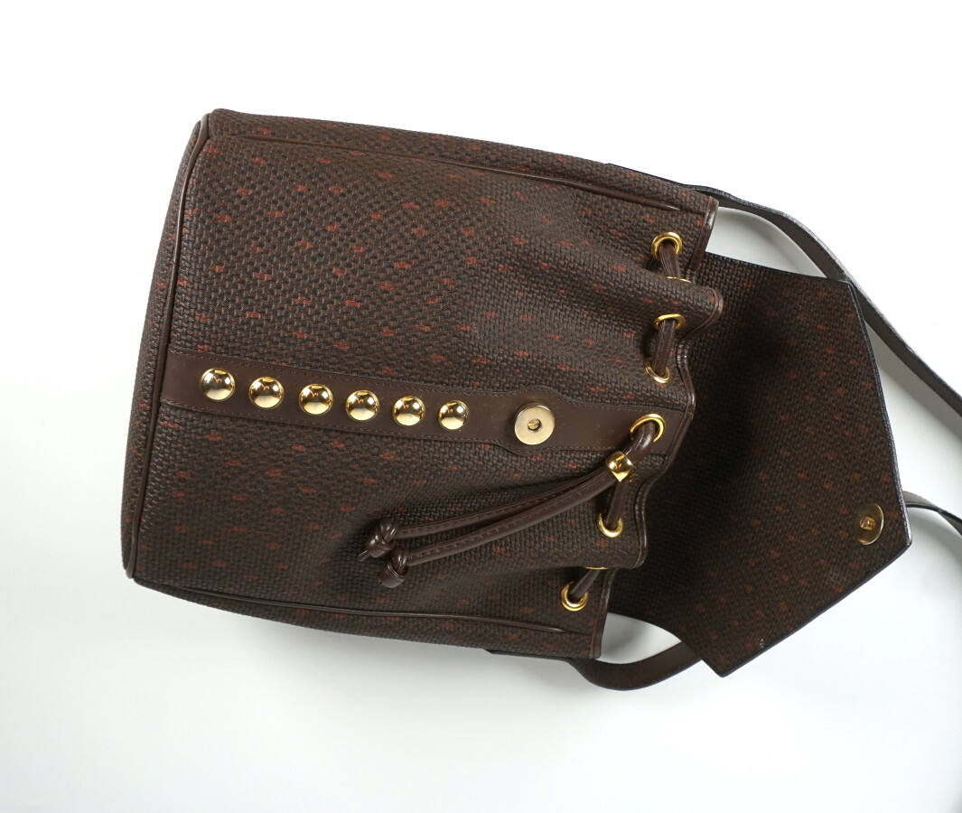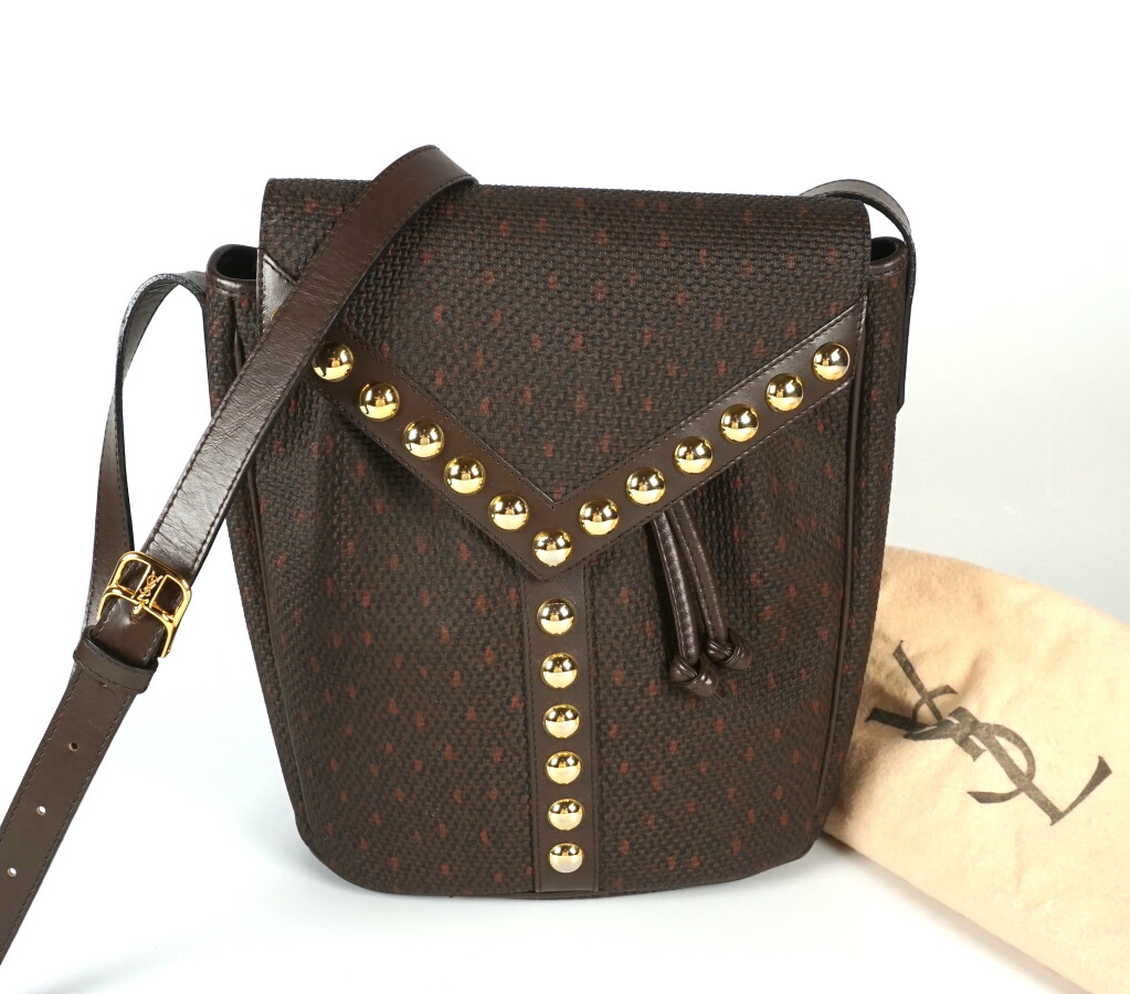 YVES SAINT-LAURENT : Sac à main "Besace" en toile enduite brun chiné et cuir brun, agrémentées de clous en métal doré, anse bandoulière réglable, intérieur tissu monogrammé, pochette zippée, H. 25 cm (très bel état).