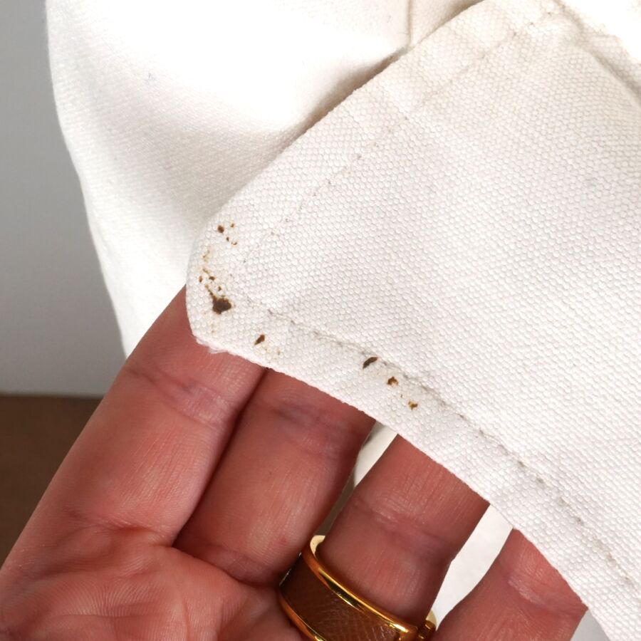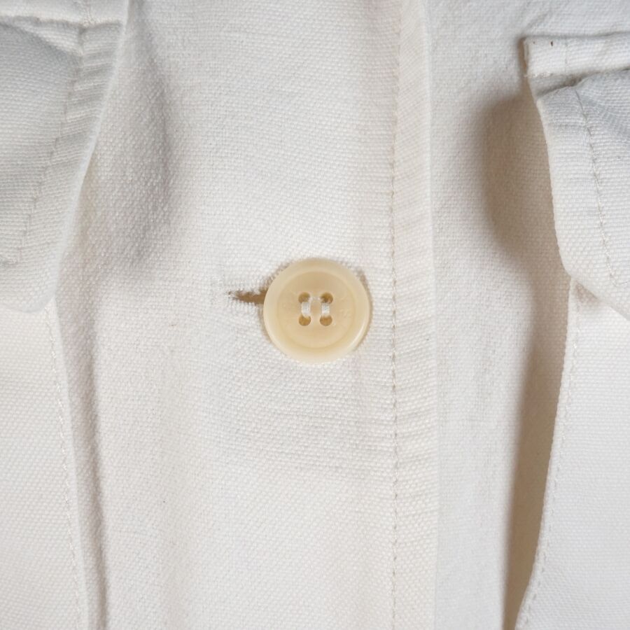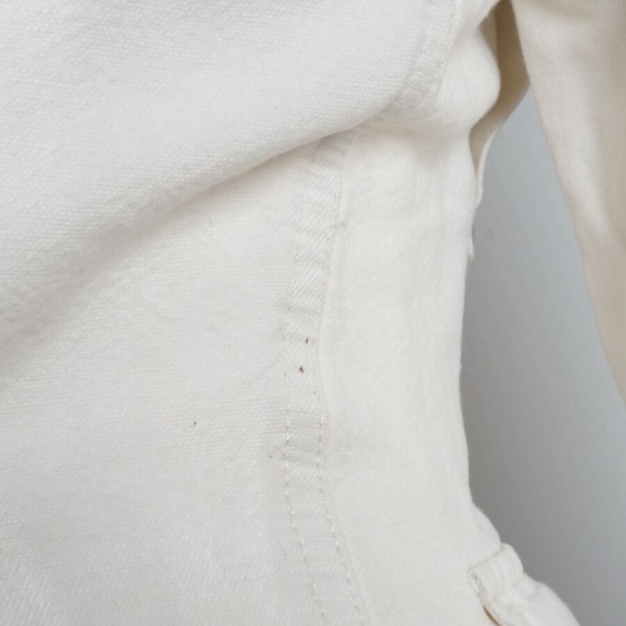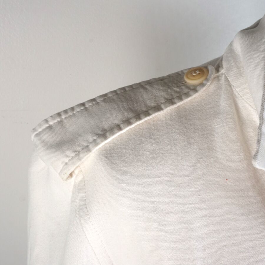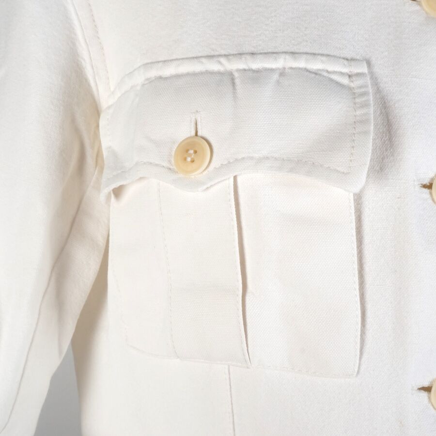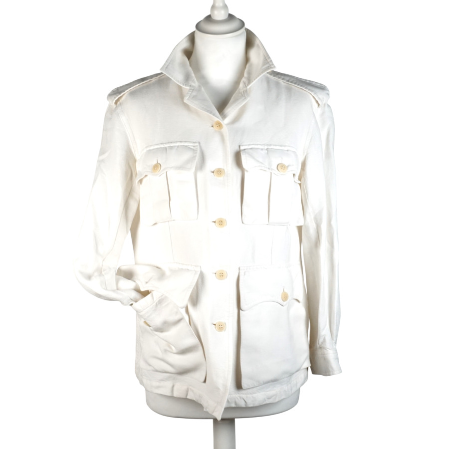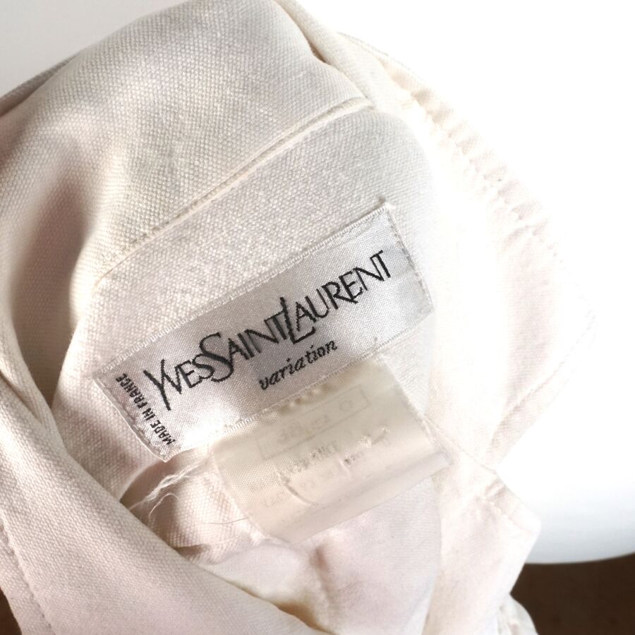 YVES SAINT-LAURENT : Veste en coton blanc cassé, fermeture à l'avant à cinq boutons logotés, quatre poches avec fermeture à boutons logotés, taille supposée M, H. Totale : 68/69 cm environ (petites taches brunes sur la poche basse droite, quelques légers fils tirés).