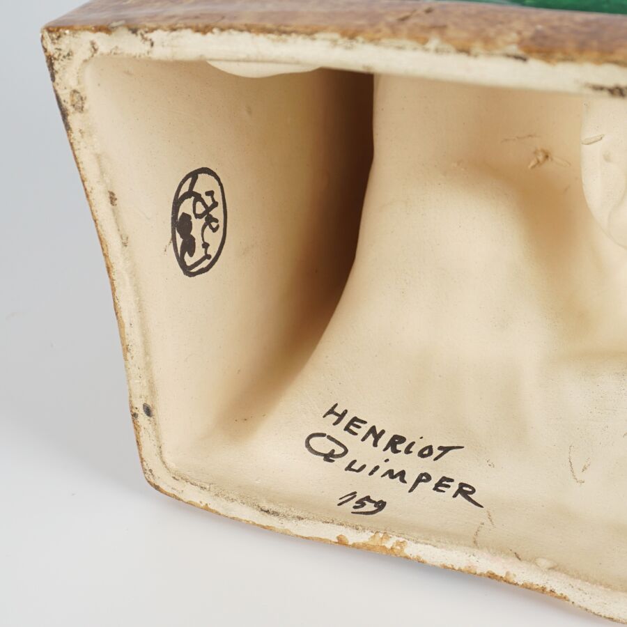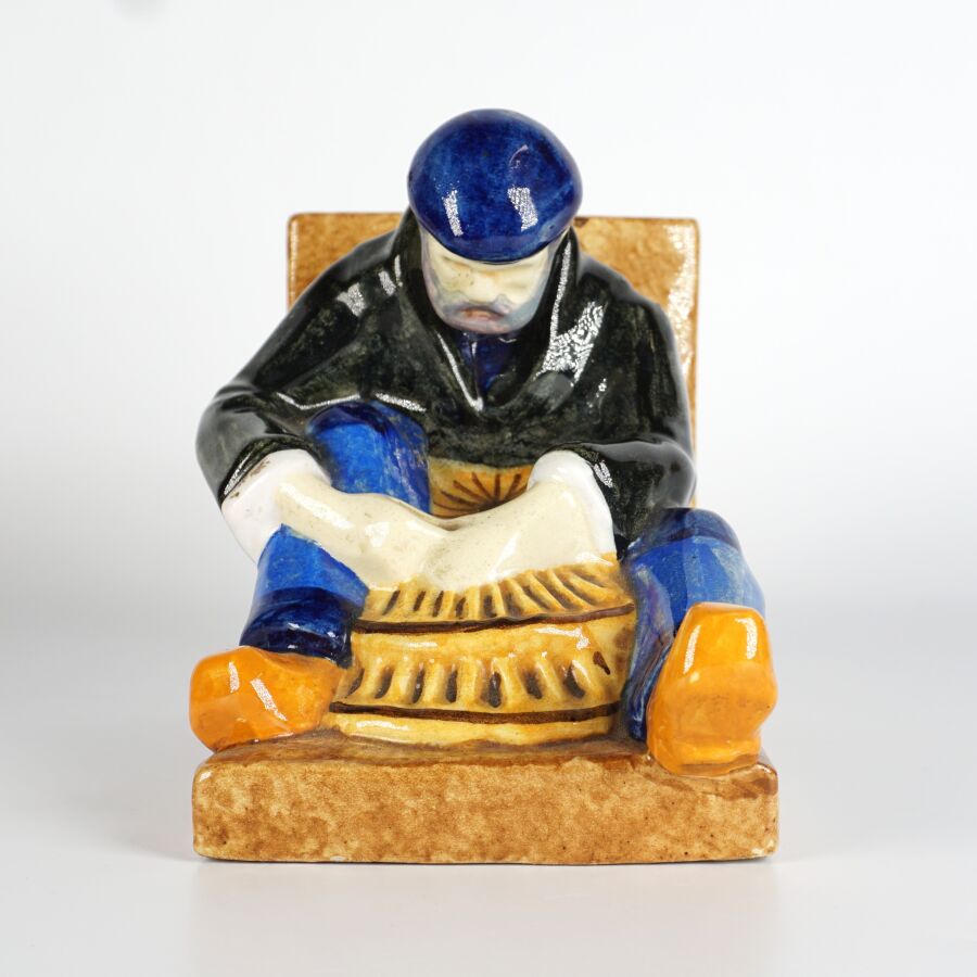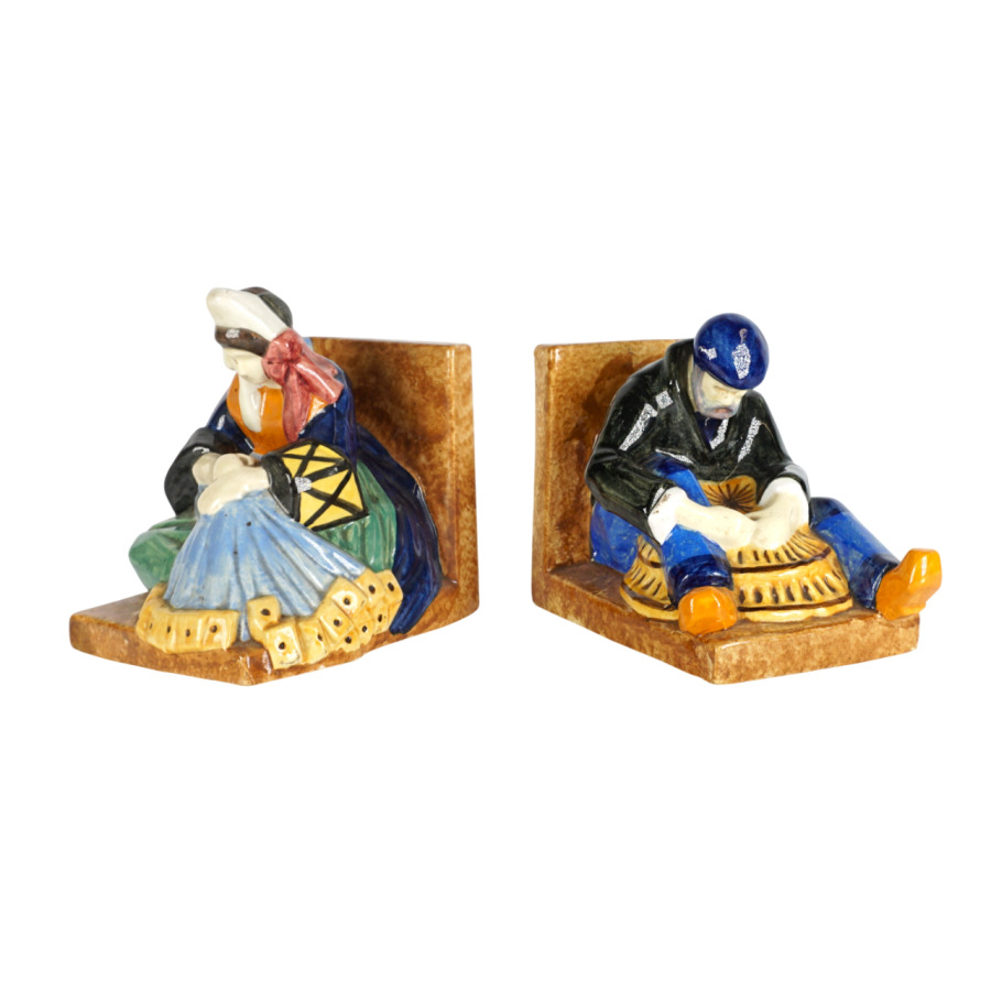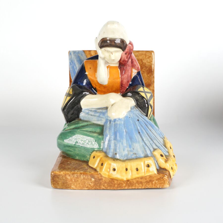 Yvonne JEAN-HAFFEN (1895-1993) - HENRIOT QUIMPER : Paire de serre-livres en faïence émaillée polychrome à décor de pêcheurs à leur ouvrage, signés et numérotés 159 dessous, circa 1930, H. 16 cm (infimes éclats).