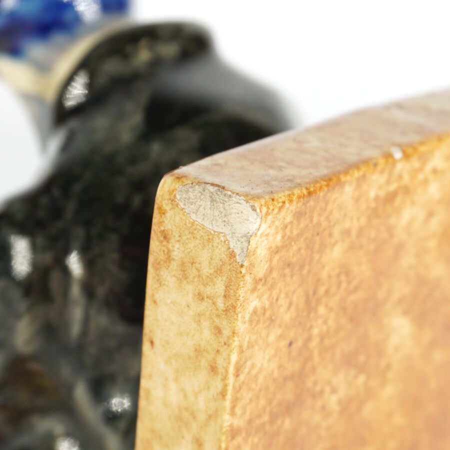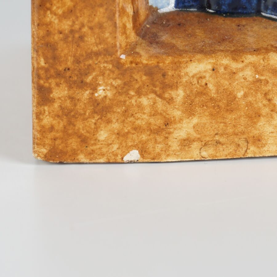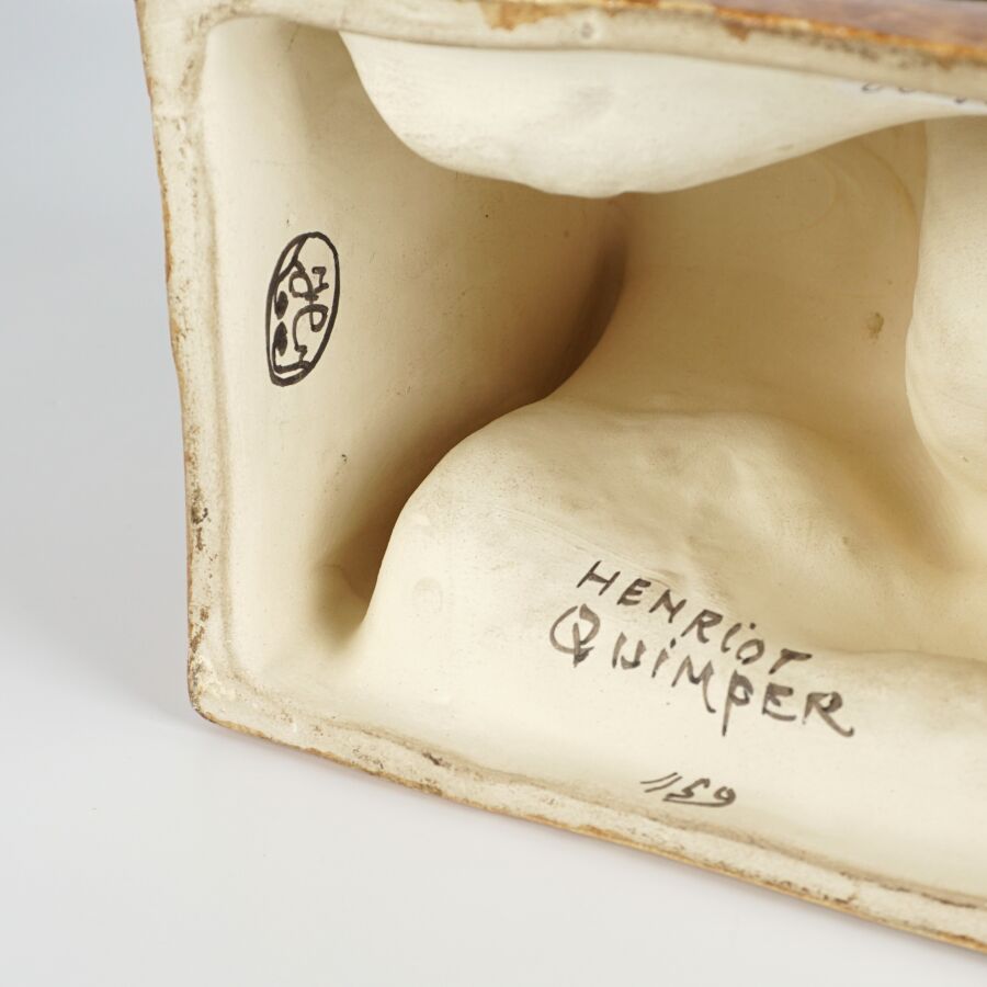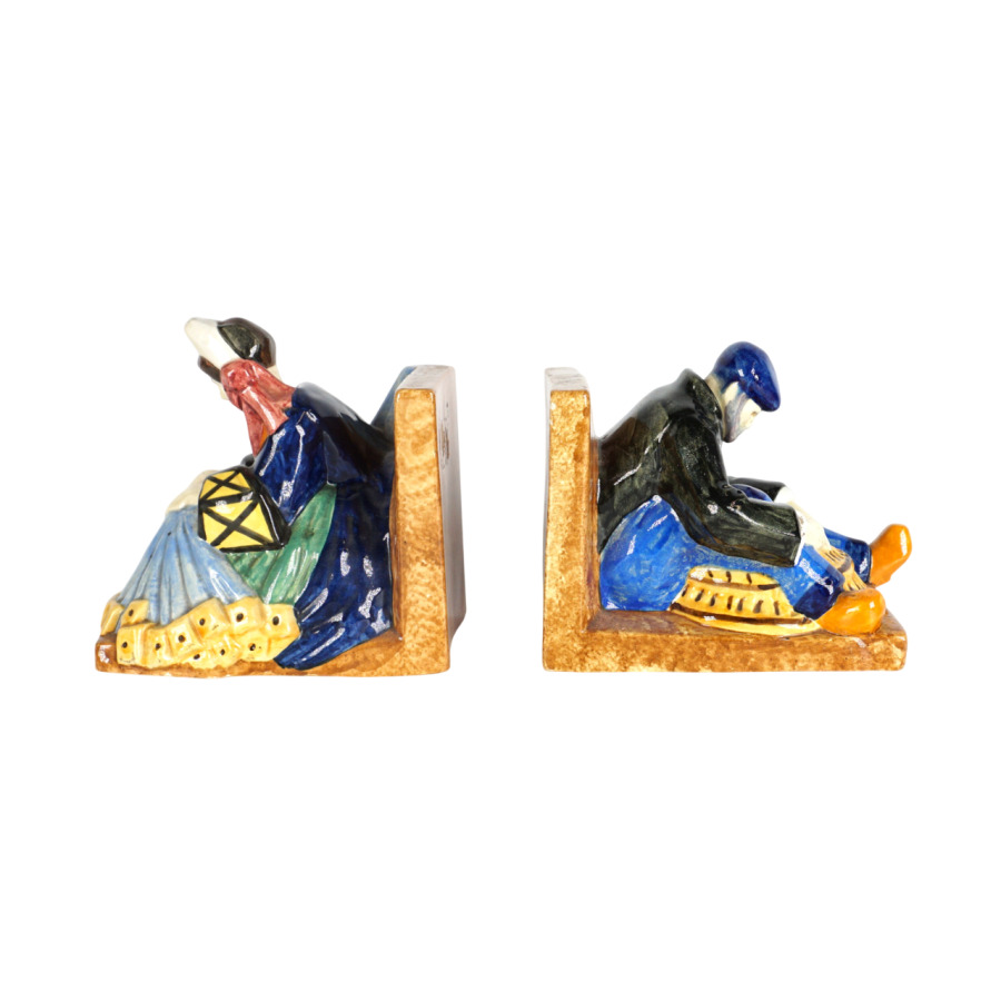 Yvonne JEAN-HAFFEN (1895-1993) - HENRIOT QUIMPER : Paire de serre-livres en faïence émaillée polychrome à décor de pêcheurs à leur ouvrage, signés et numérotés 159 dessous, circa 1930, H. 16 cm (infimes éclats).