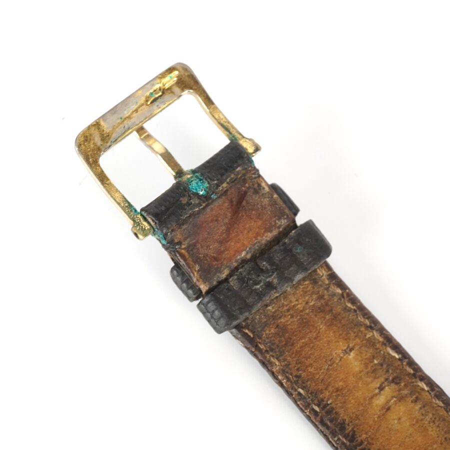 ZENITH : Montre bracelet d'homme, boîtier en or jaune 18K (750/oo), poinçon tête de cheval (1838-1919), cadran rond, fond champagne, chiffres arabes pour les heures, mouvement mécanique à remontage manuel, bracelet en cuir noir probablement rapporté, boucle ardillon en métal, D. Cadran : 3.2 cm. Poids brut : 32 g environ (bracelet en l'état).