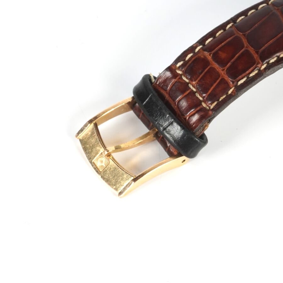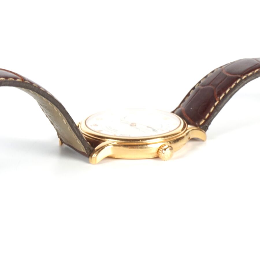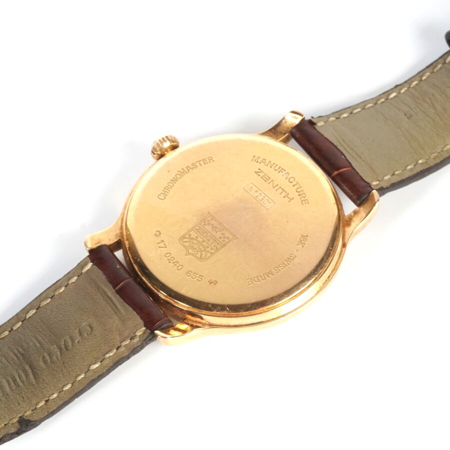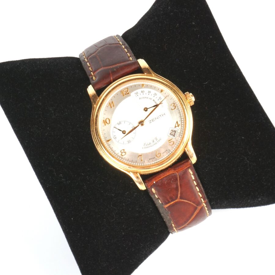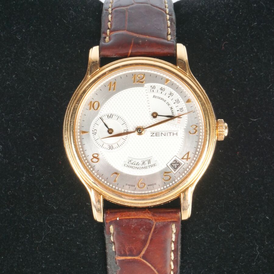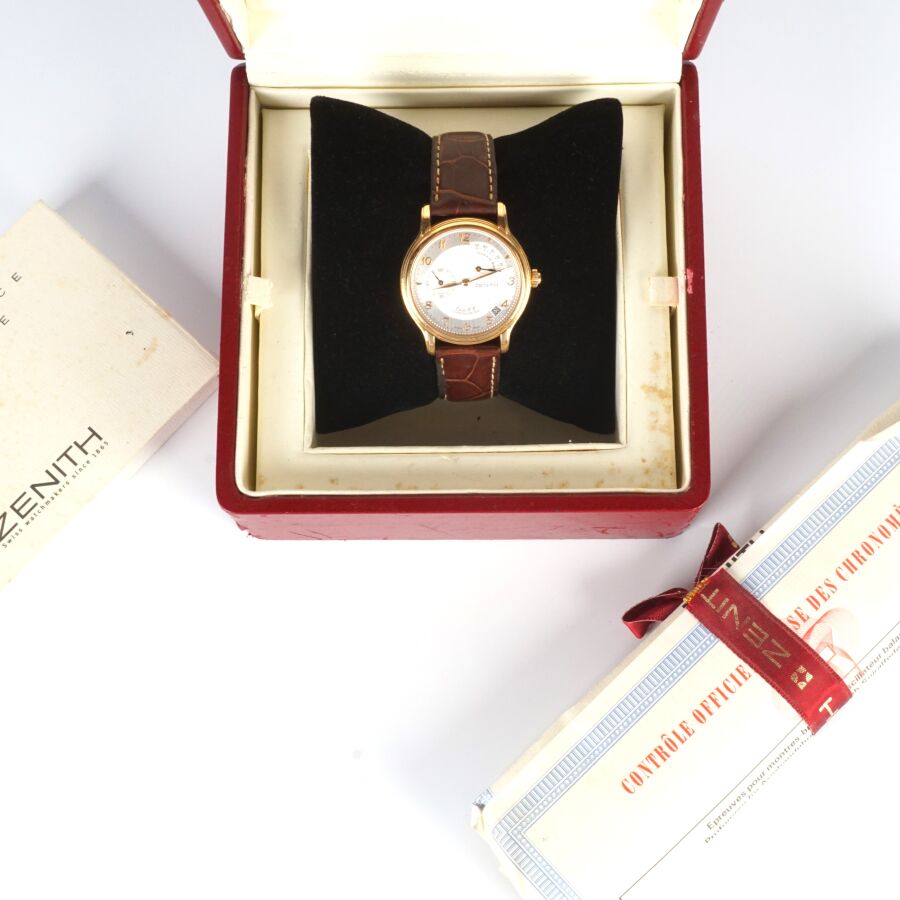 ZENITH : Montre bracelet modèle "Elite", boîtier en or jaune 18K (750/oo), boîtier rond, cadran nacré et guilloché au centre, signé, chiffres arabes pour les heures, chronomètre à 9H, guichet dateur à 4H30 et réserve de marche en haut à droite, fond à clip, signé et numéroté, bracelet en cuir rapporté, boucle ardillon en or jaune 18K (750/oo) non logotée, circa 2000, présentée dans sa boîte d'origine, avec notice et documents, ainsi qu'un contrôle officiel suisse par la Maison Zenith, Diam. Boîtier : 3.6 cm. L. Totale : 23.2 cm. Poids brut : 55.1 g environ (usures au bracelet).
