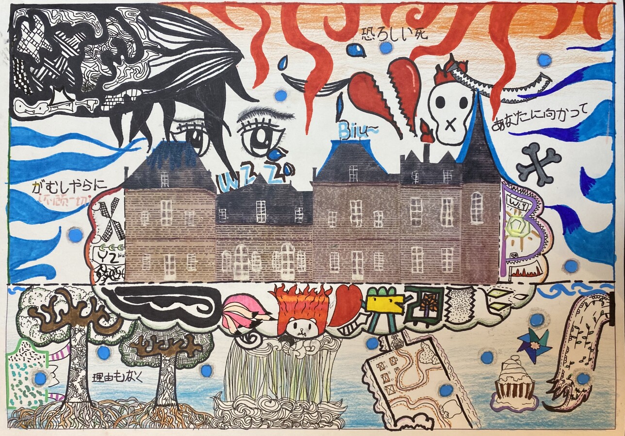 Zi YAN, "Mal et la paix", dessin et aquarelle sur papier, 29.7 x 42 cm. * Cocréation avec Malgorzata Paszko.