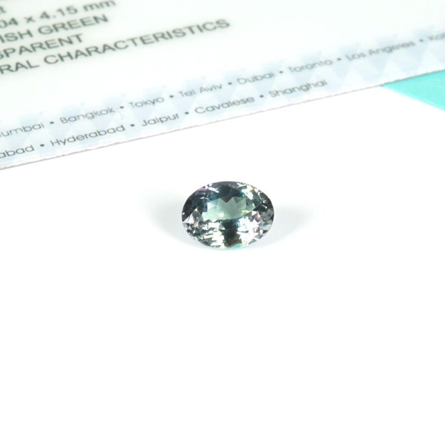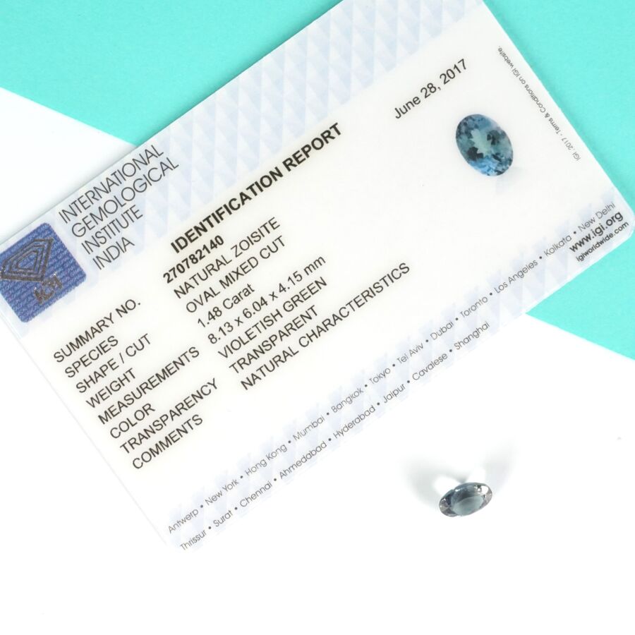 Zoïsite sur papier, taille ovale, calibrant 1.48 ct, couleur "Violetish green", Dim. 8.1 x 6 x 4.1 mm, présentée avec son certificat de l'International Gemological Institute India en date du 28 juin 2017.