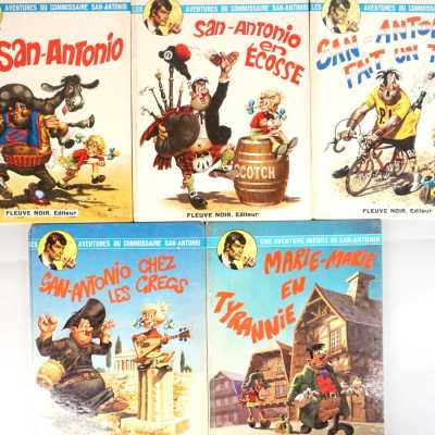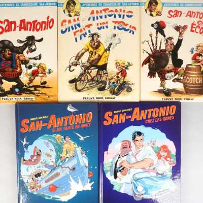 - 3 albums, éd. FLEUVE NOIR : Olé San Antonio, San Antonio fait un tour, San Antonio en Écosse. État moyen.