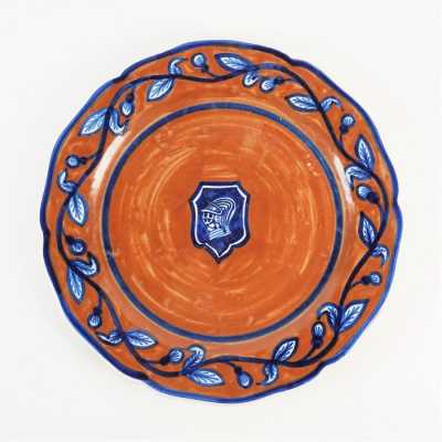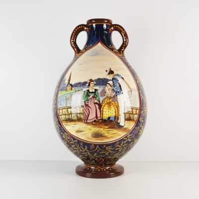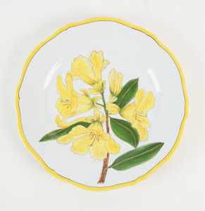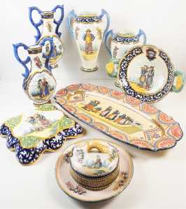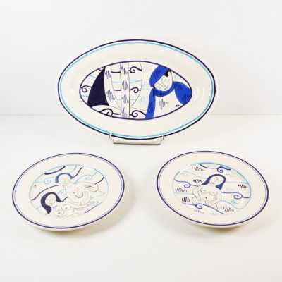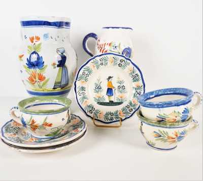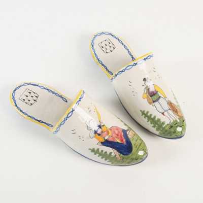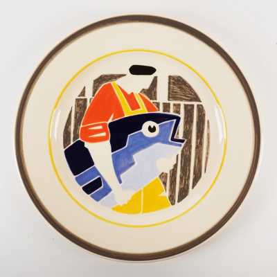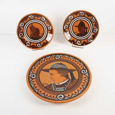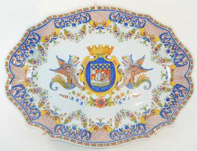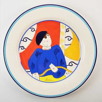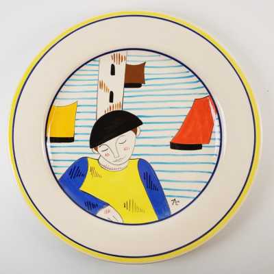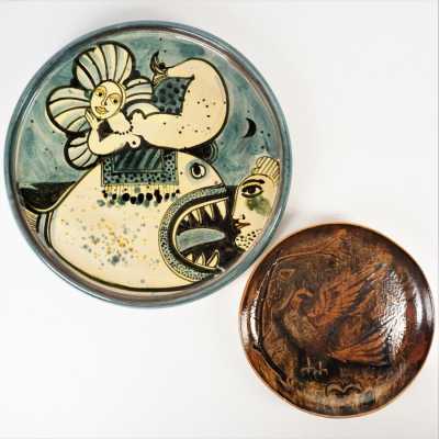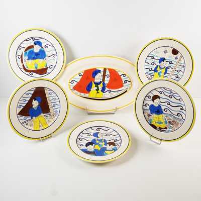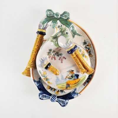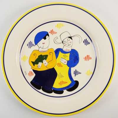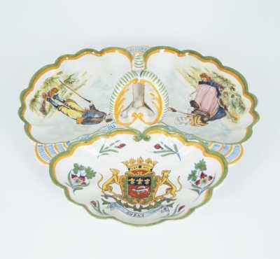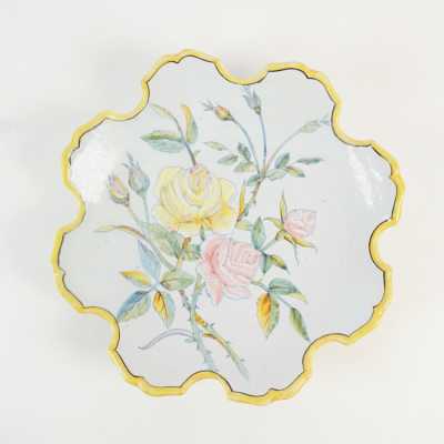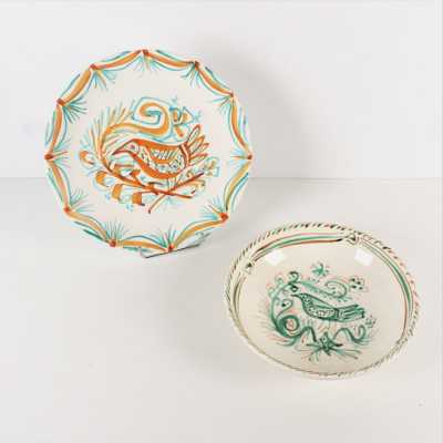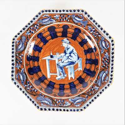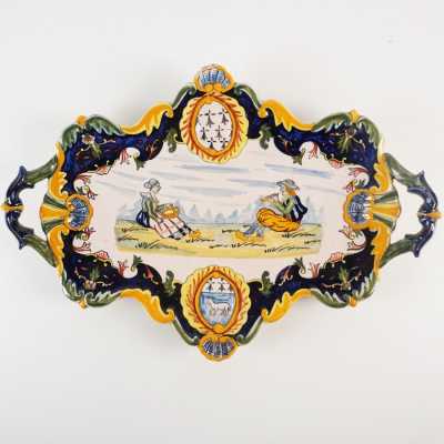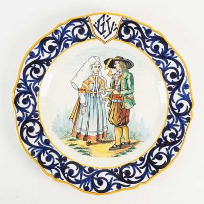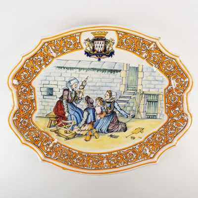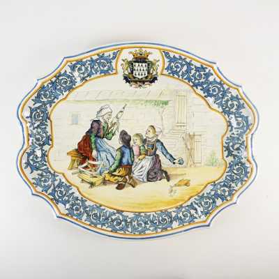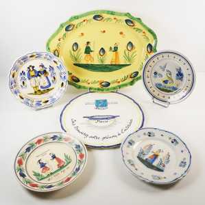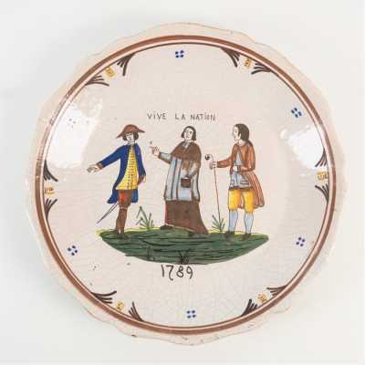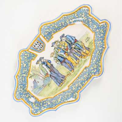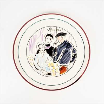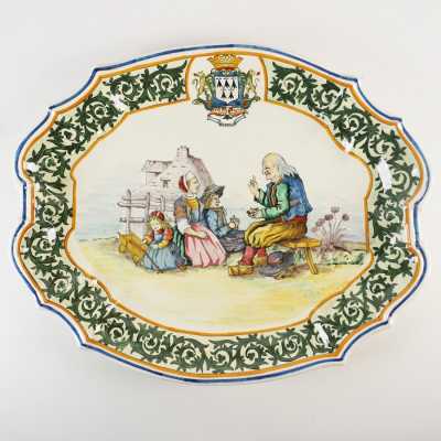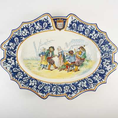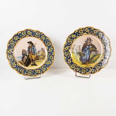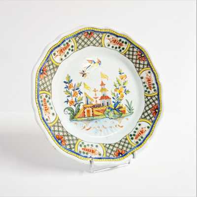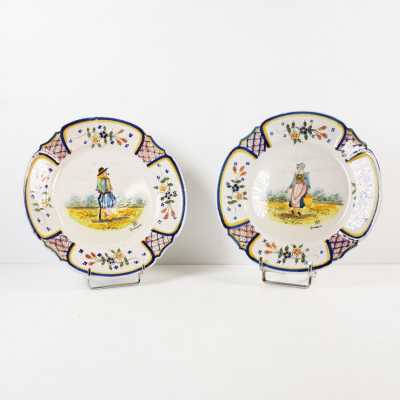 On joint deux plats, l'un à bords festonnées à décor d'une scène de paysannerie su...