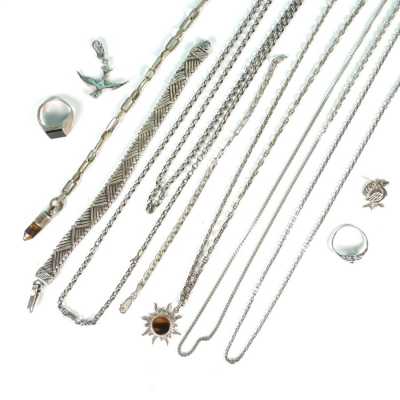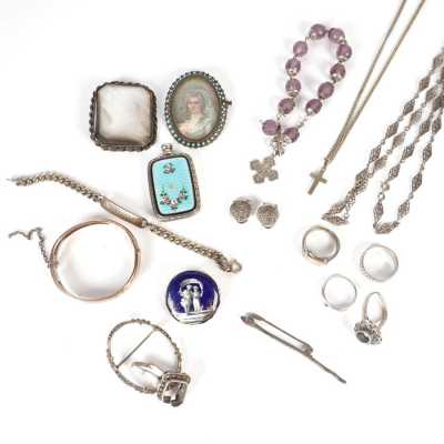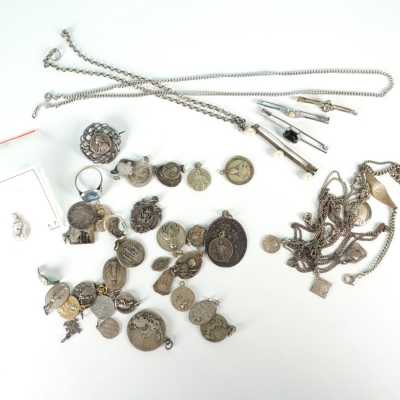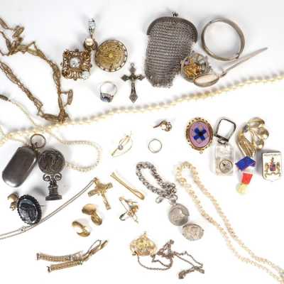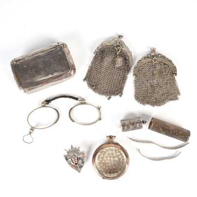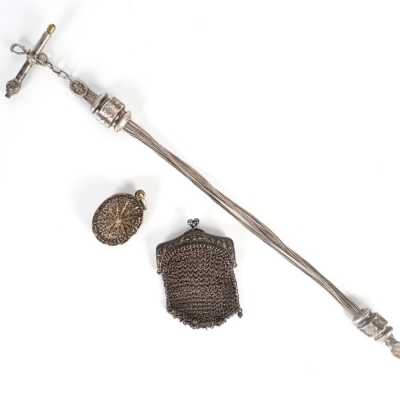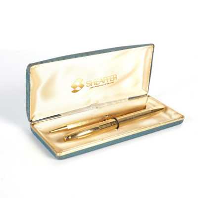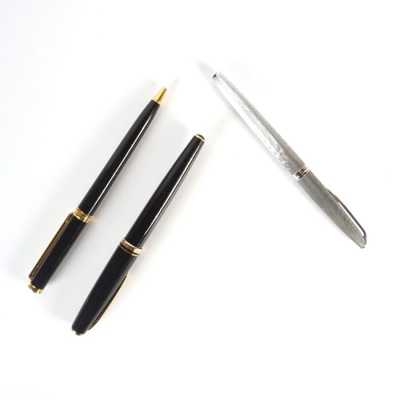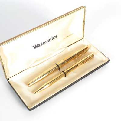 On y joint WATERMAN : Stylo en métal argenté, plume en or blanc 18K (750/oo), L. 13.4 (légèrement piqué).