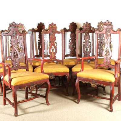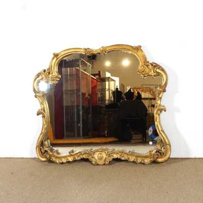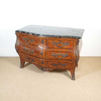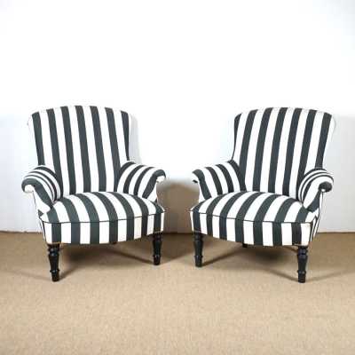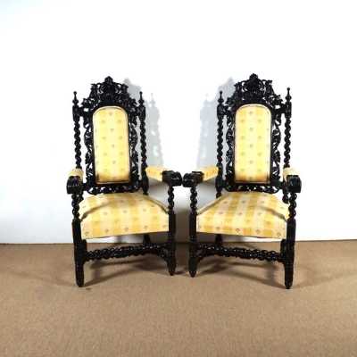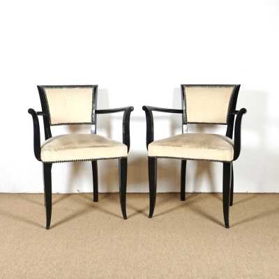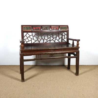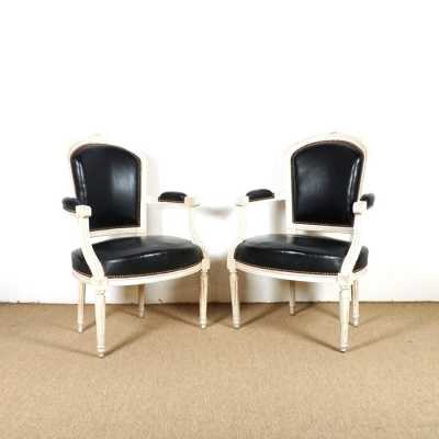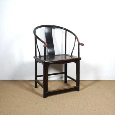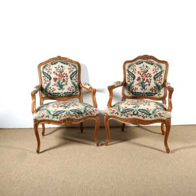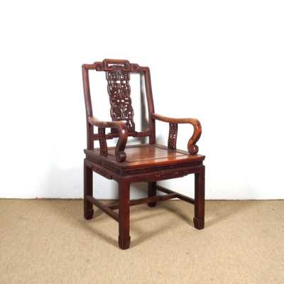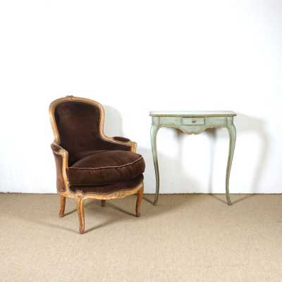 - Fauteuil en bois mouluré à décor de fleurettes, piétement cambré, garniture marron, H. 86 cm.