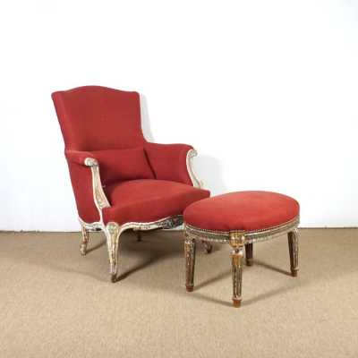 On joint un repose-pied en bois mouluré, trace de polychromie, piétement fuselé et cannelé, de style Louis XVI, garnitur...
