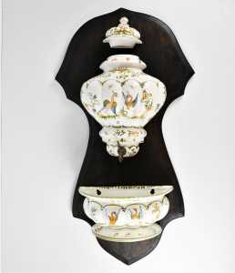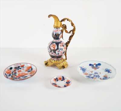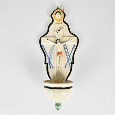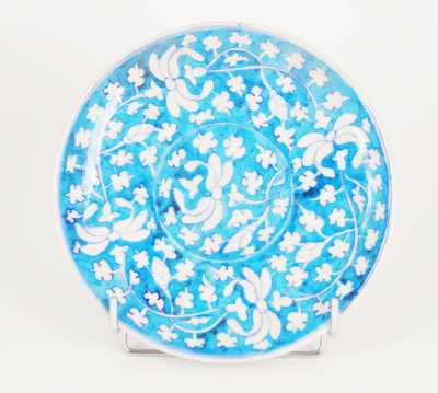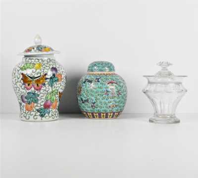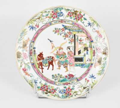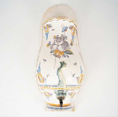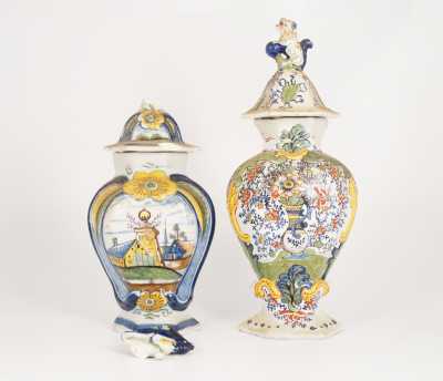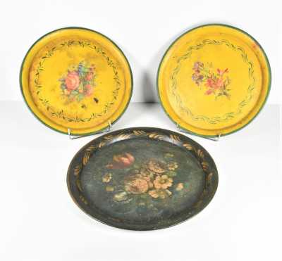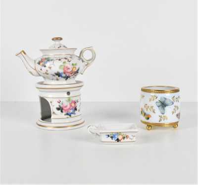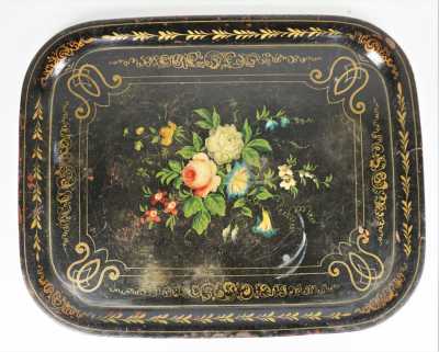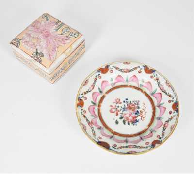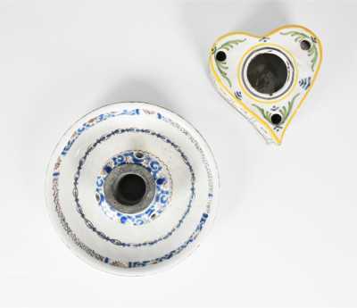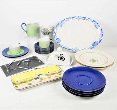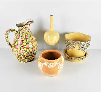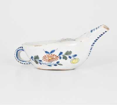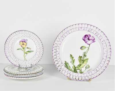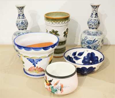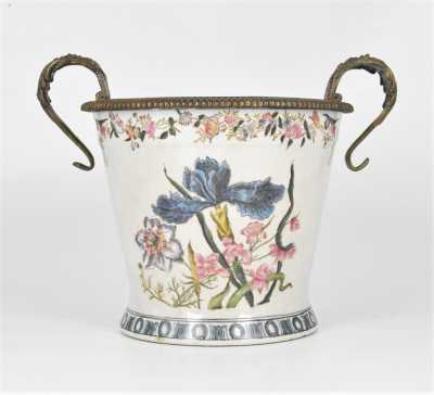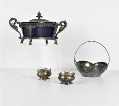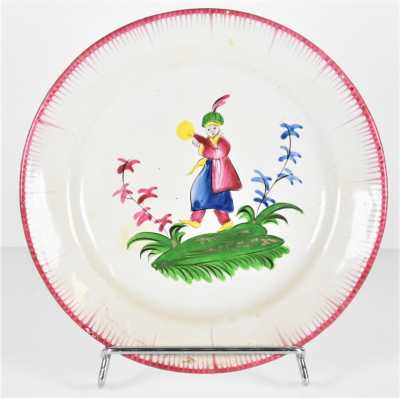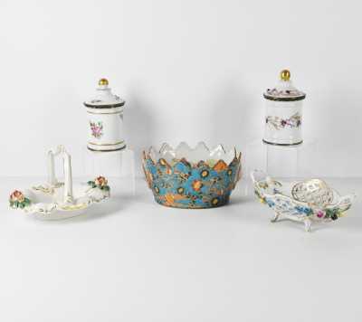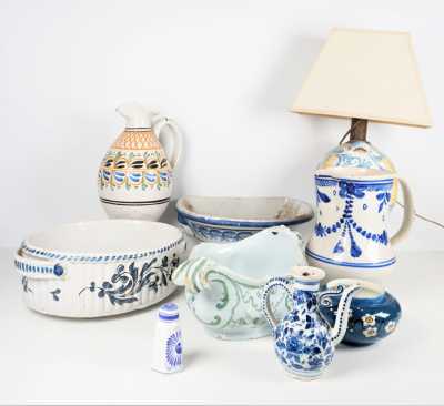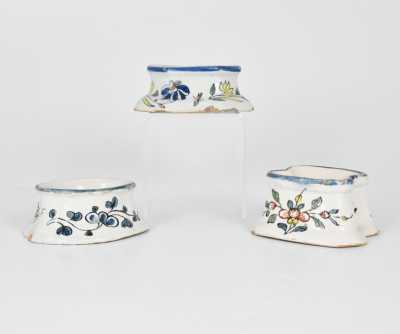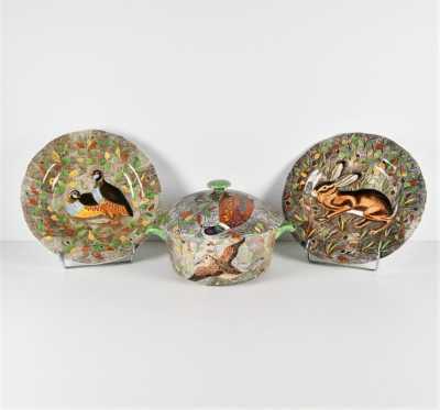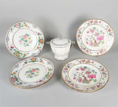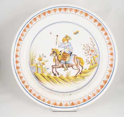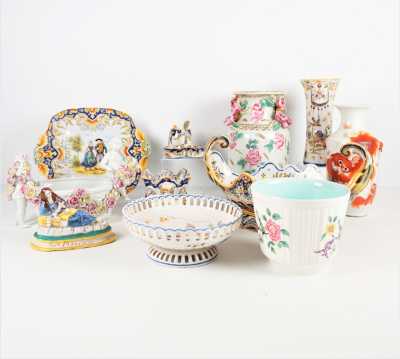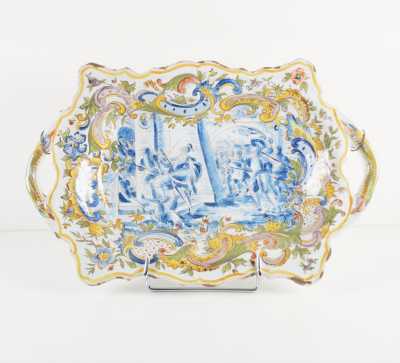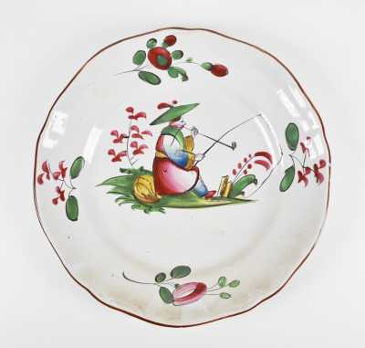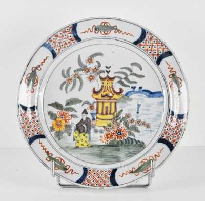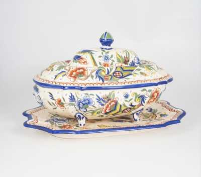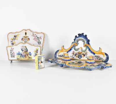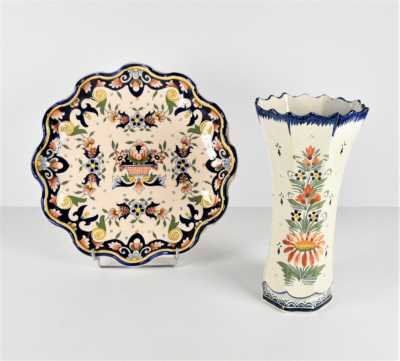 On joint un plat tripode en faïence émaillée polychrome à bords chantournés à motif de fleurs et paniers fleuris...