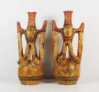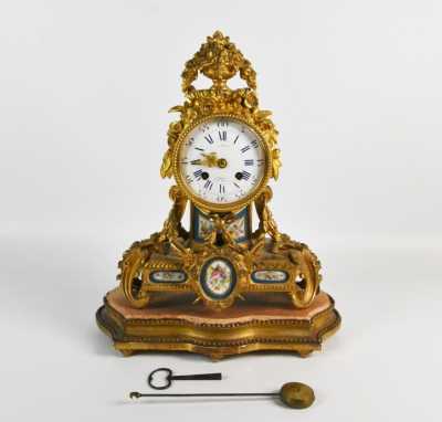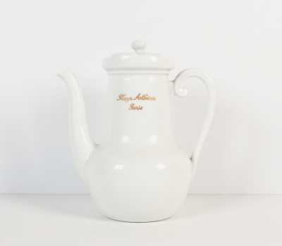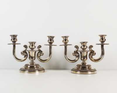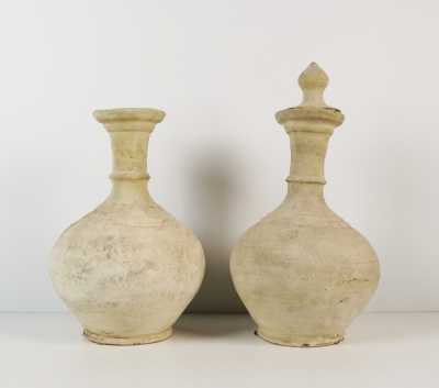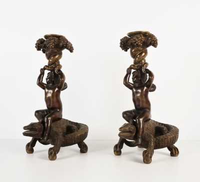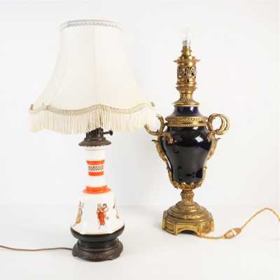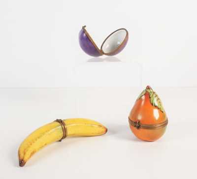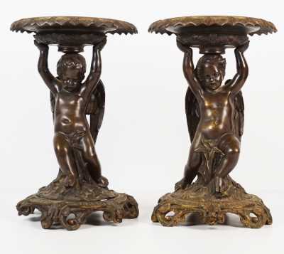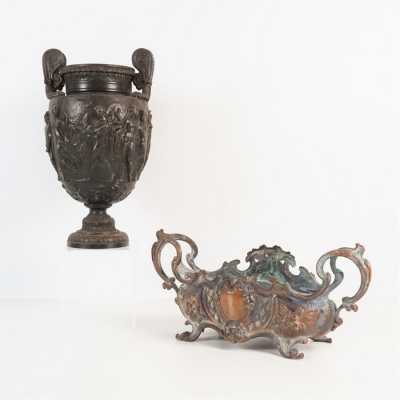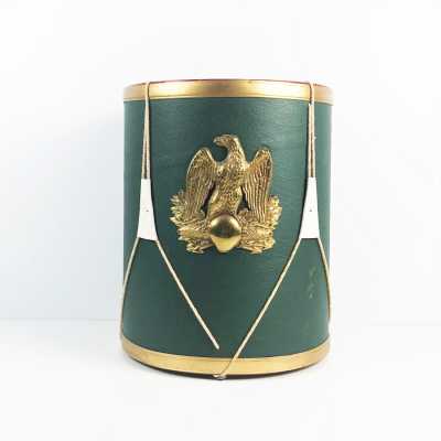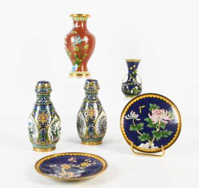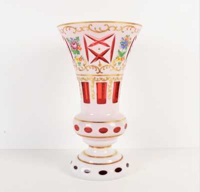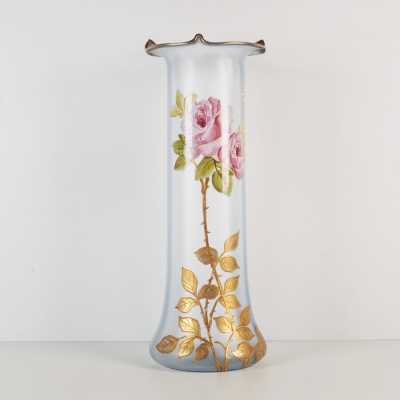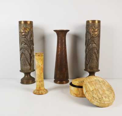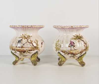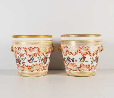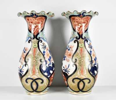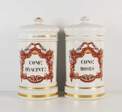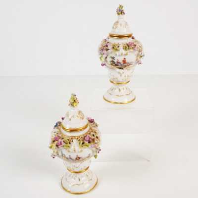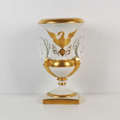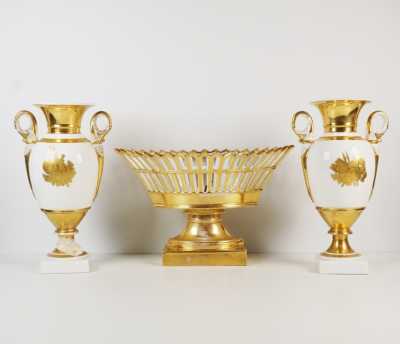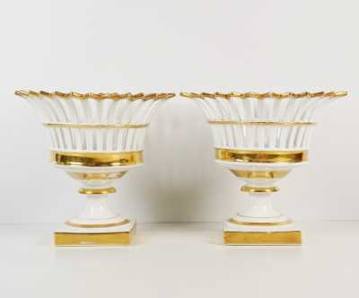 On joint une paire de vases de forme Médicis sur piédouche en porcelaine émaillée rehaussée à l'or à décor de trophé...