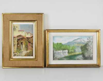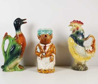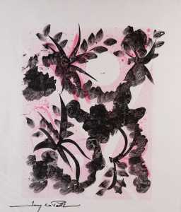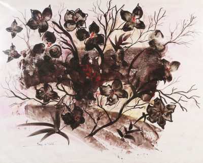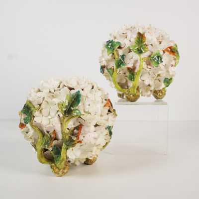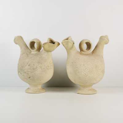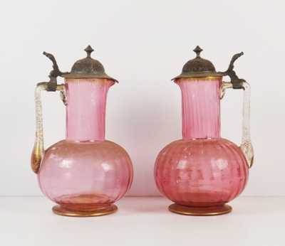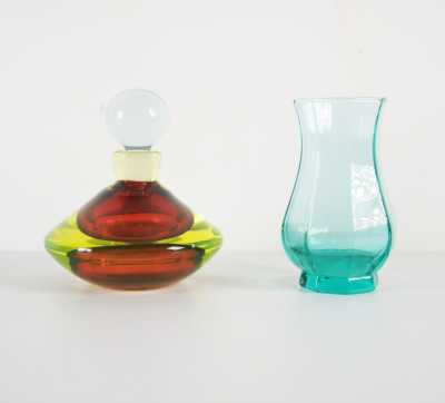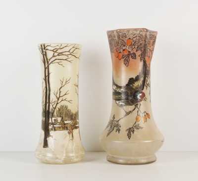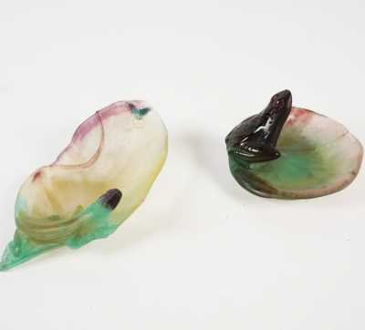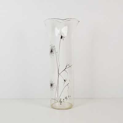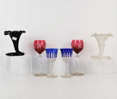On joint deux vases cornets, l'un en verre transparent, l'autre noir, figurant des fleurs aquatiques, piètement enroulé, H. 12 cm (traces...