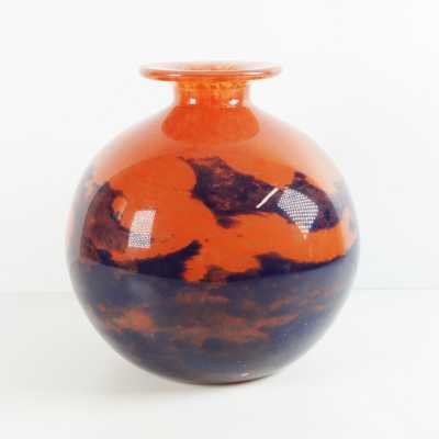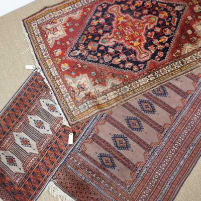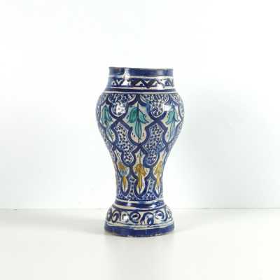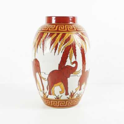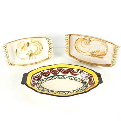On joint un plat creux ovale, à deux anses latérales, céramique émaillée à décor géométrique, marqué ...