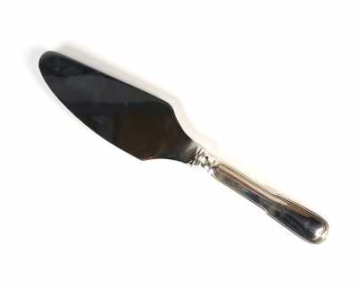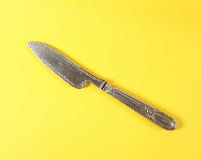 - Un couteau à petits fours le manche en argent fourré orné de feuillages, la lame en métal doré orné d'un brin...