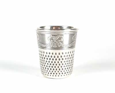 On joint un petit dé à coudre en métal doré, H. 1.2 cm.