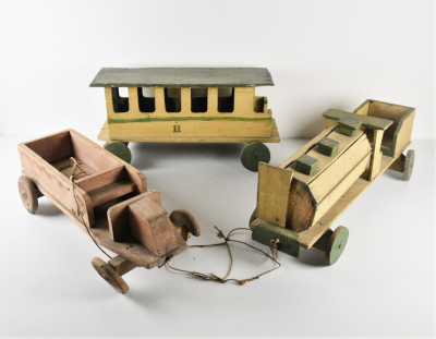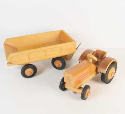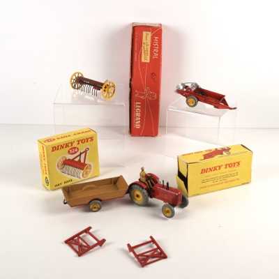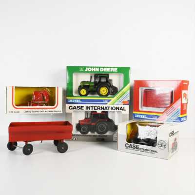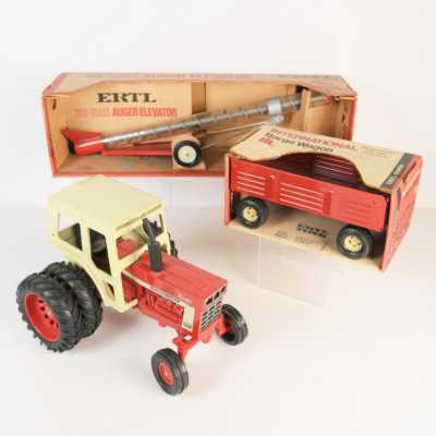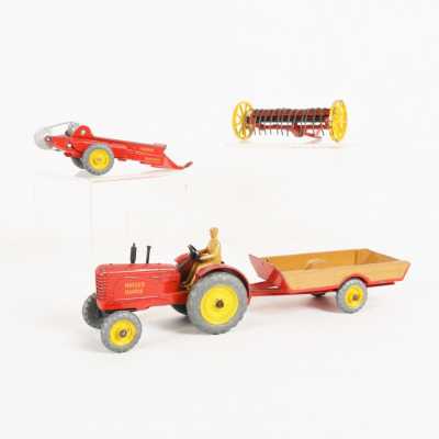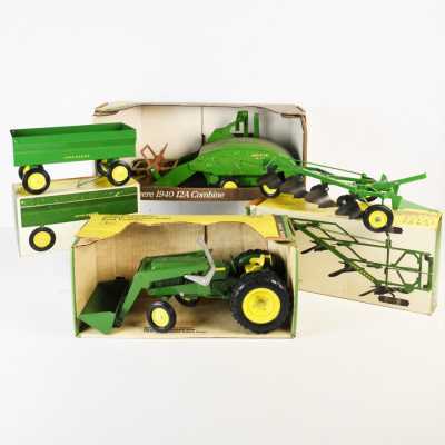 On joint trois accessoires John Deere dont 1 benne verte, charrue à 4 cor...