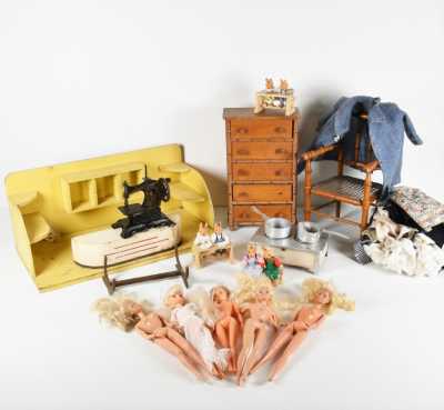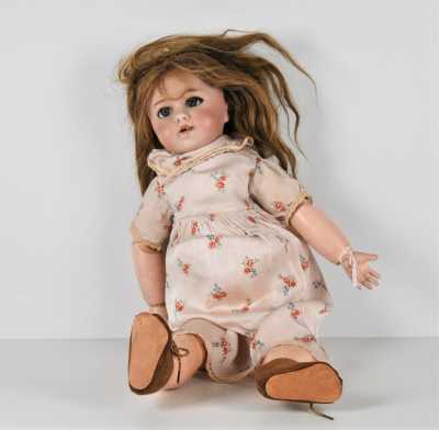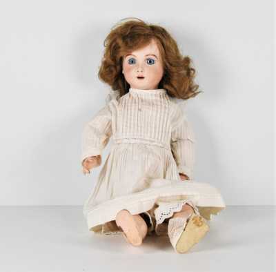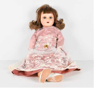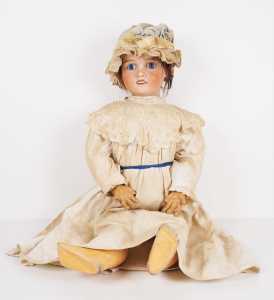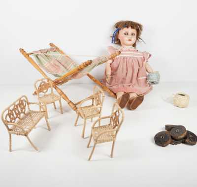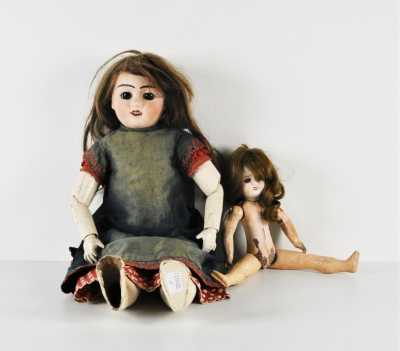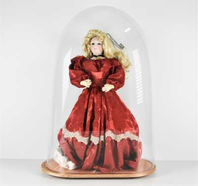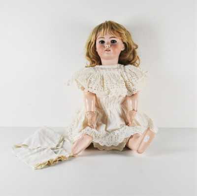 On joint une mignonnette bouche fermée, tête en porcelaine "Limoges France JB 01", H. 28 cm (l'ensemble en l'état, manques, accidents).
