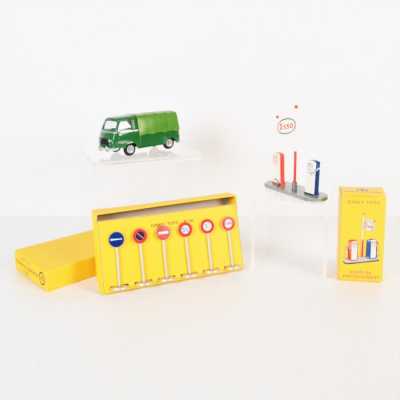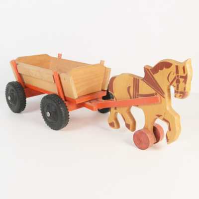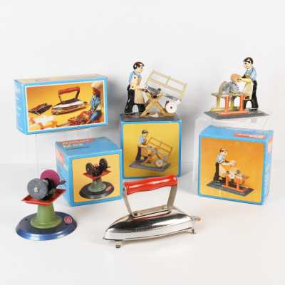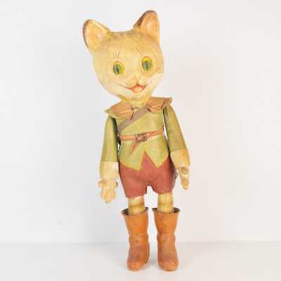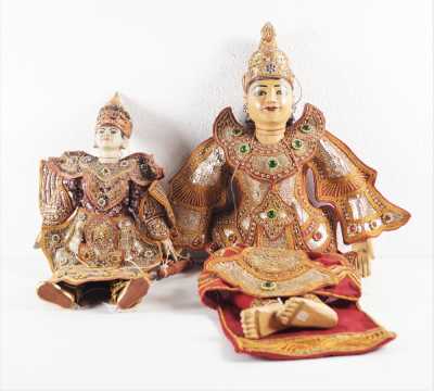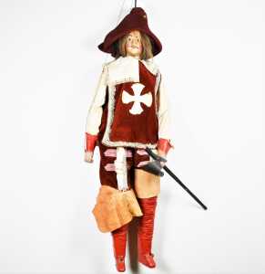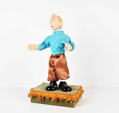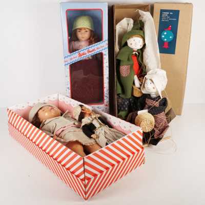 On joint deux marionnettes en bois peint "l'atelier du jardin", H. 49 cm, et une reproduction d'après Katell Le Goarnig, "jeu de grâc...