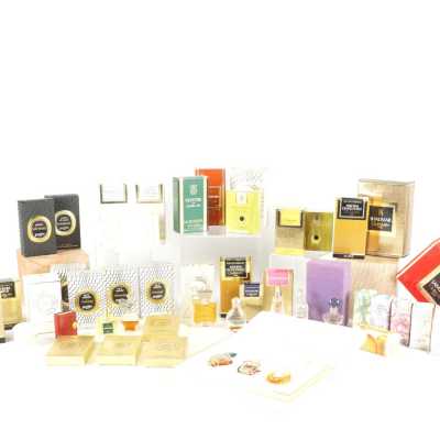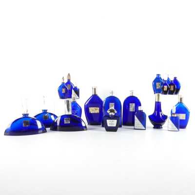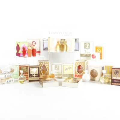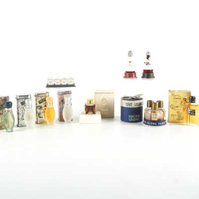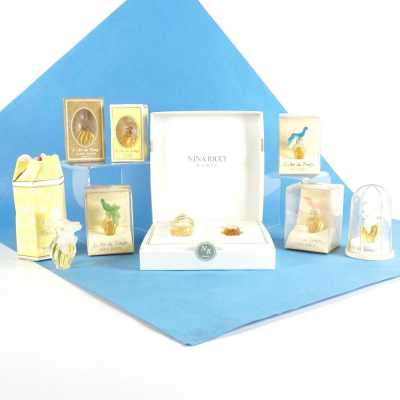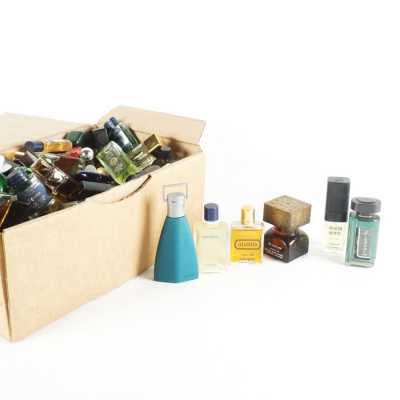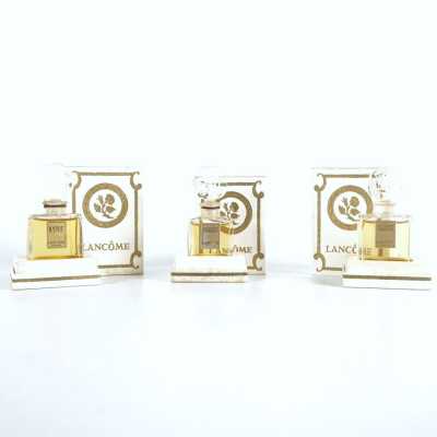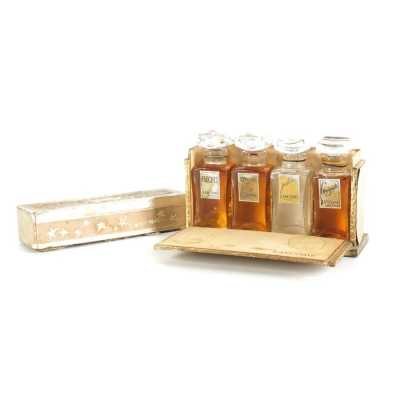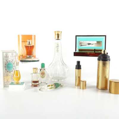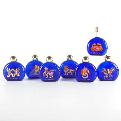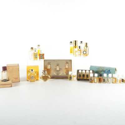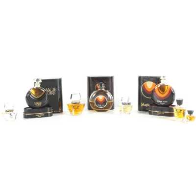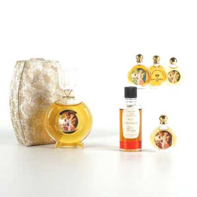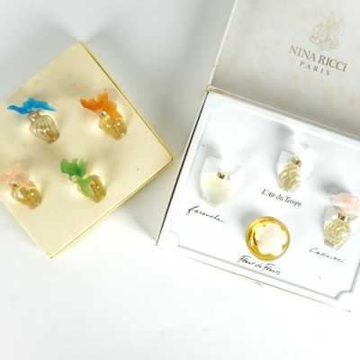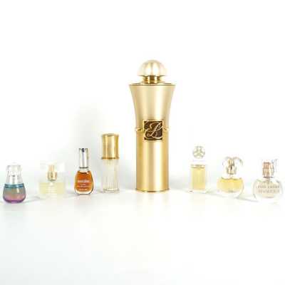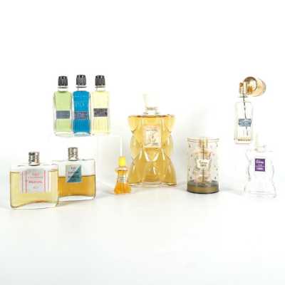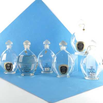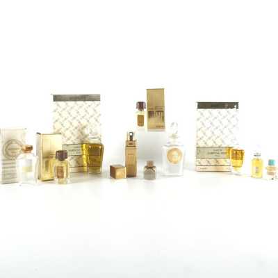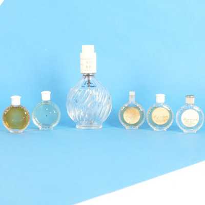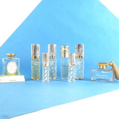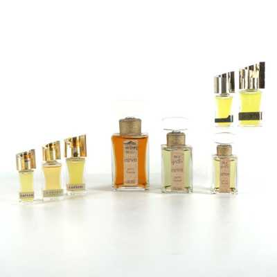 On joint de la même marque, 7 flacons et miniatures (un vide, certains liquides en état d'usage).