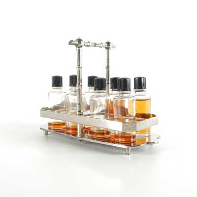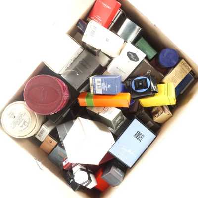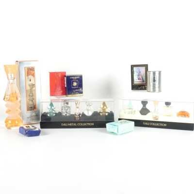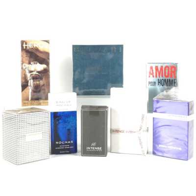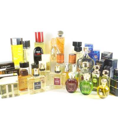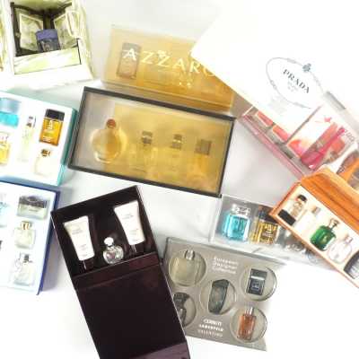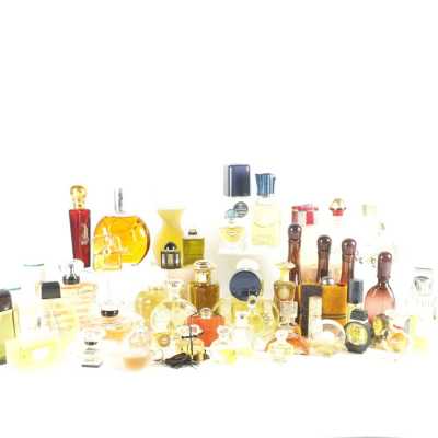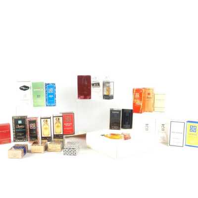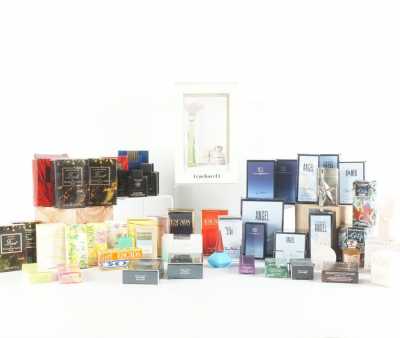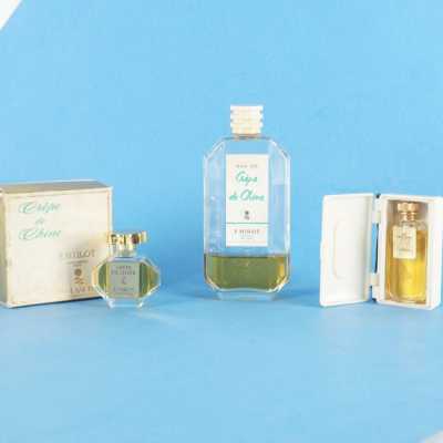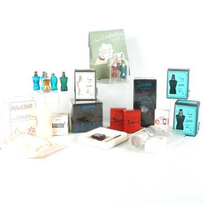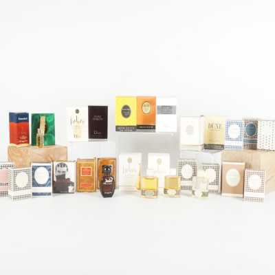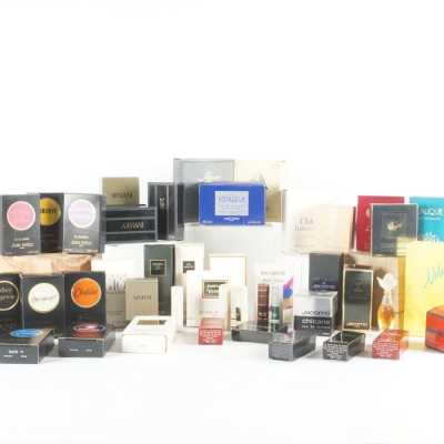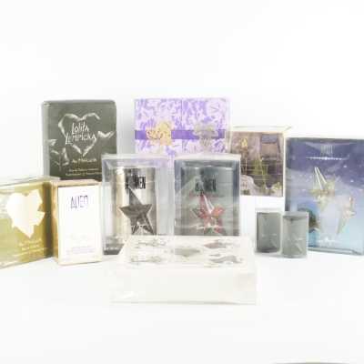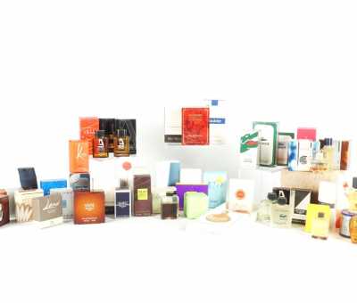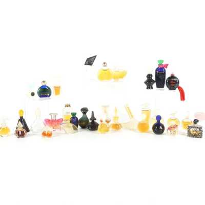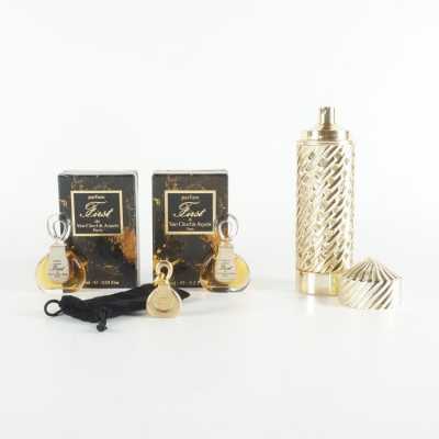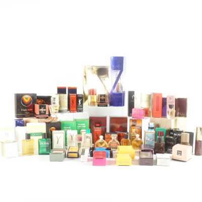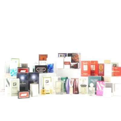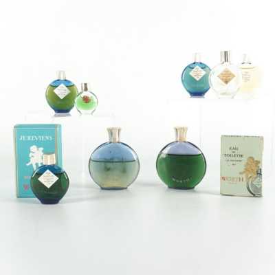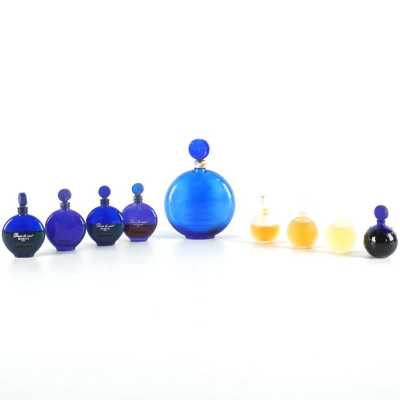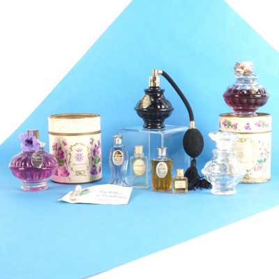 On joint de la même marque, 7 flacons et miniatures (un vide, certains liquides en état d'usage).