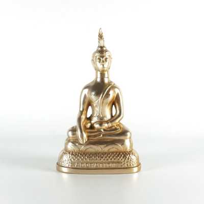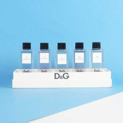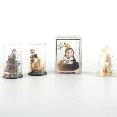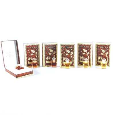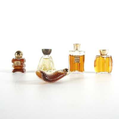 On joint cinq flacons miniatures de forme pastilles en verre, bouchons en métal doré et plastique comprenant (2) "Ma...