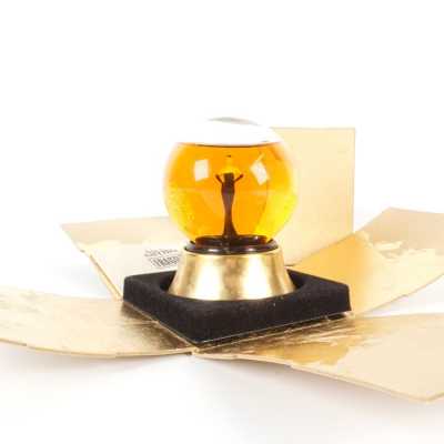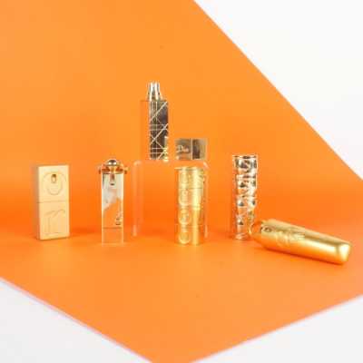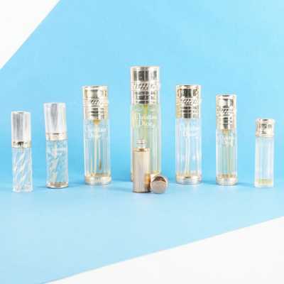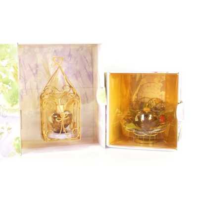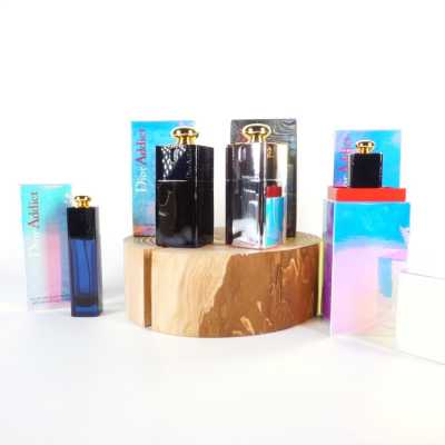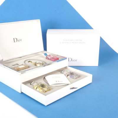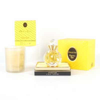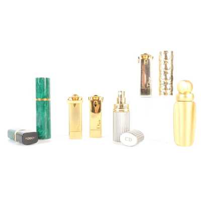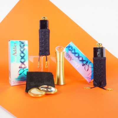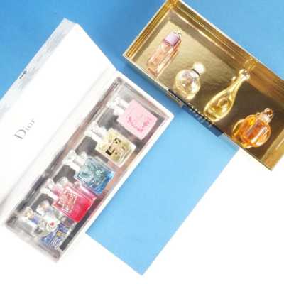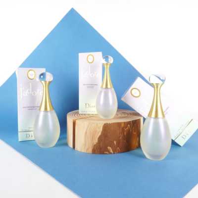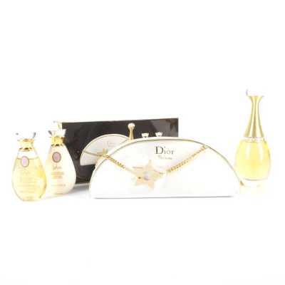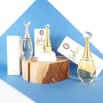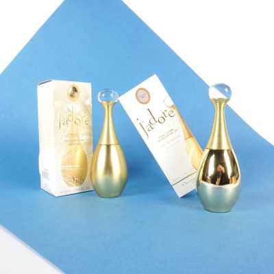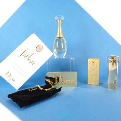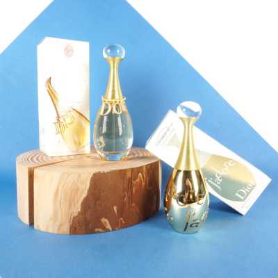 On joint "J'adore", vaporisateur de sac rechargeable doré et un parfum solide, dans un écrin ovale en métal doré et verre, dan...