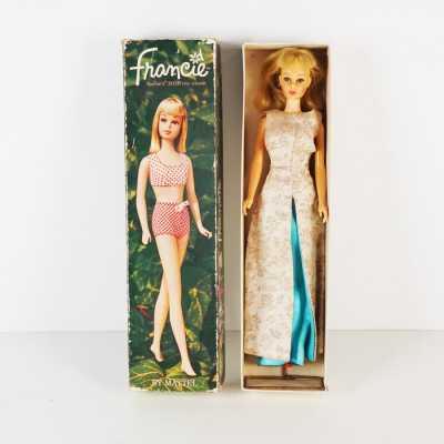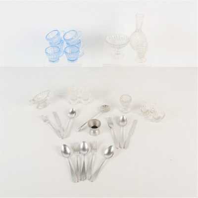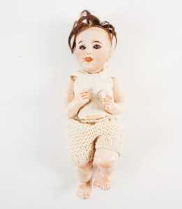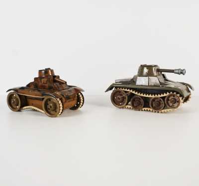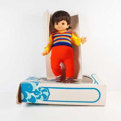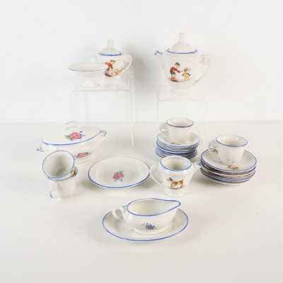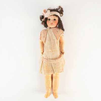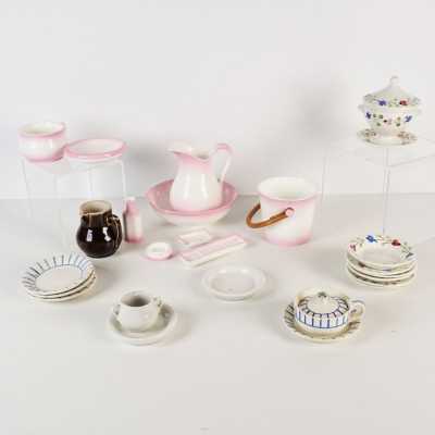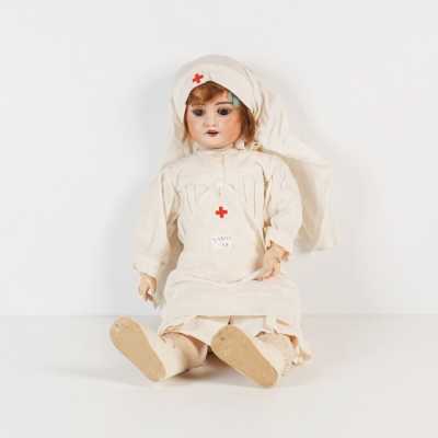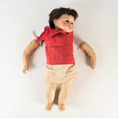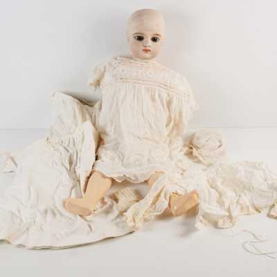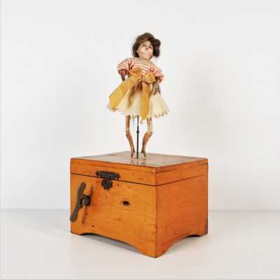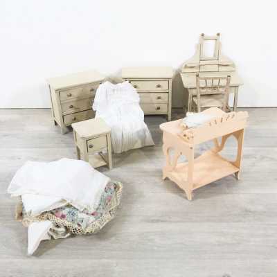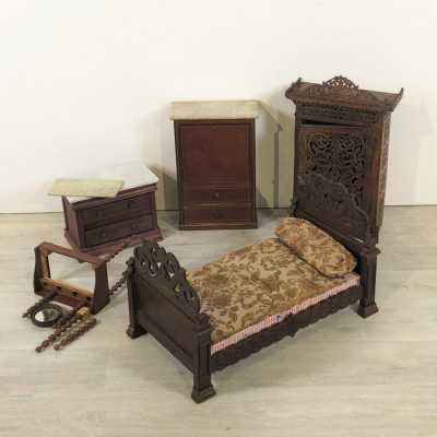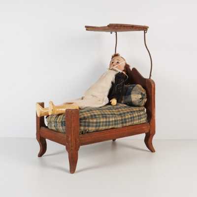 On joint un lit de poupée en bois teinté, L. 29.5 cm, H. 37 cm (en l'état).