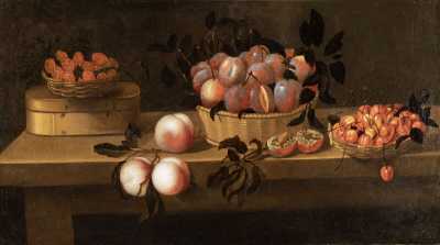 Louÿse MOILLON (1610-1696), "Nature morte de fruits, framboises dans un panier posé sur une boîte de copeaux, trois pêches posées sur la table, prunes posées dans un panier, une prune ouverte et des cerises ordonnées dans un panier, le tout disposé s...