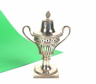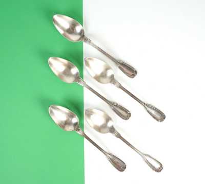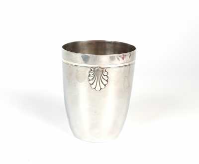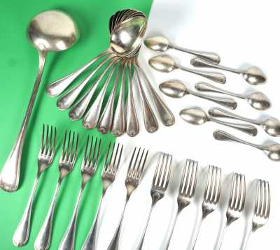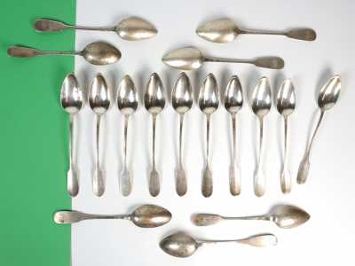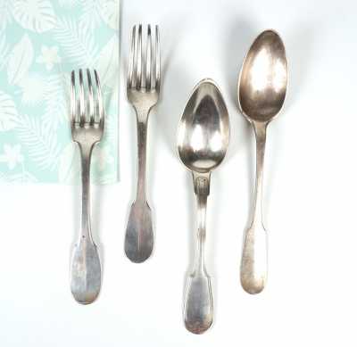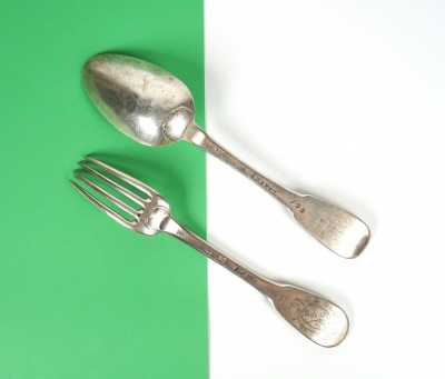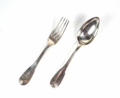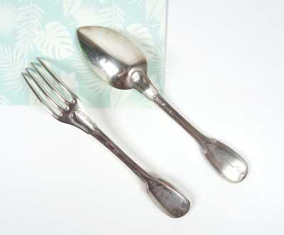 - une fourchette modèle uniplat à décor d'armoiries, poinçons des Fermiers Généraux, "A couronné" et "B" couronné, poinçon de MO "NML", probablement Nicolas-Martin Langlois, reçu en 1958, L. 19.5 cm.
