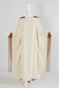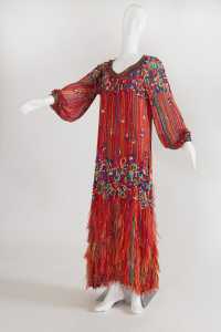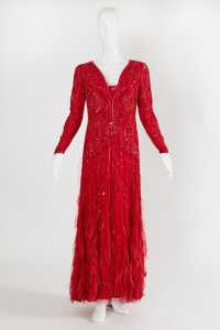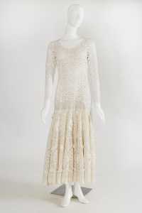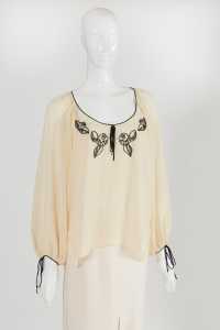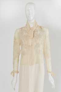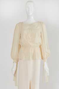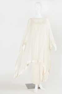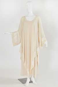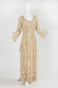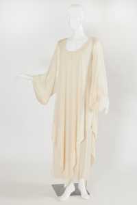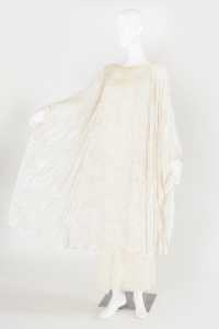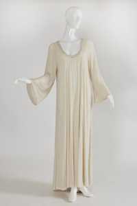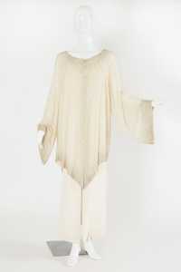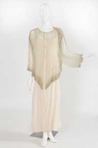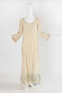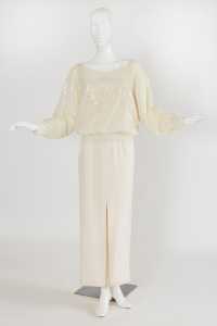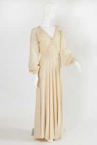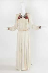 Robe longue en georgette ivoire, broderie de mini tubes et strass, décolleté en V devant et derrière, manches chemise boutonnées.