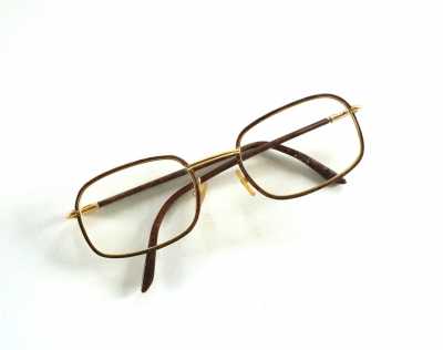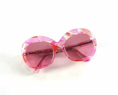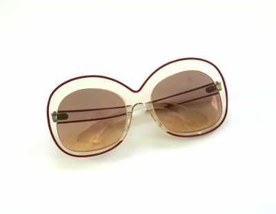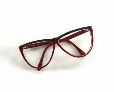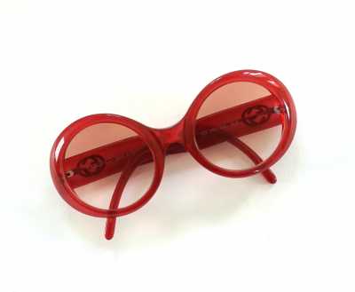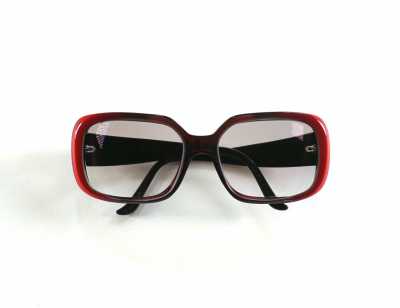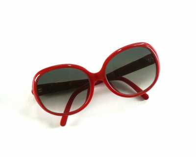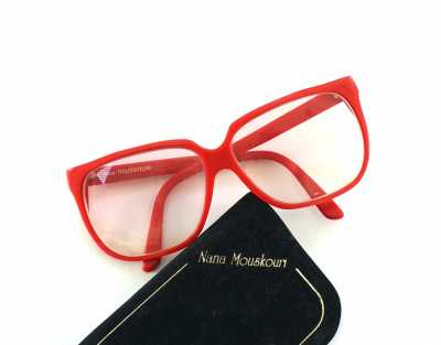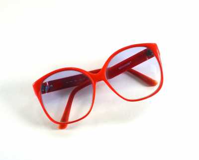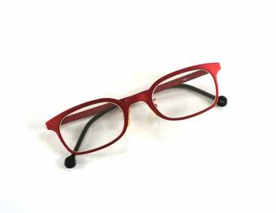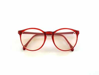 Lunettes de vue, monture cerclée rouge, verres fumés.