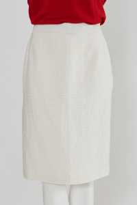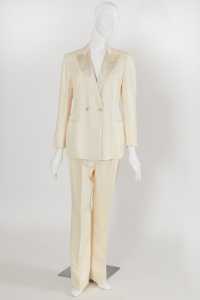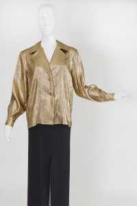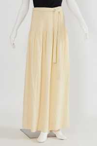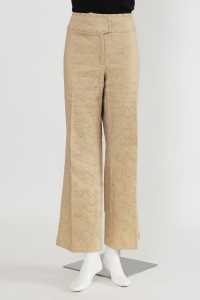Pantalon droit large en broché beige doré, ceinture cloutée.