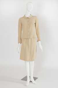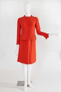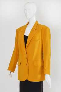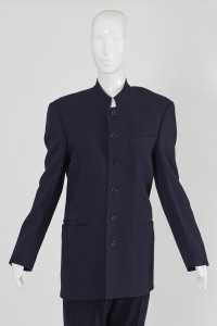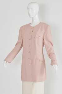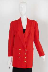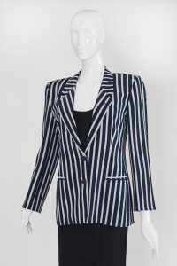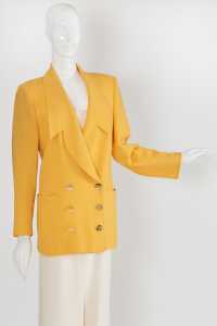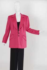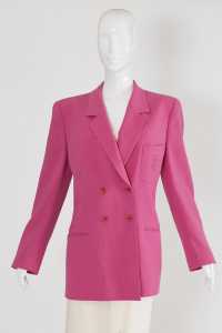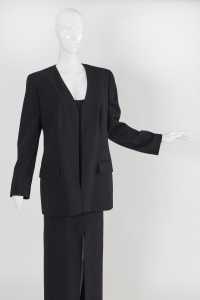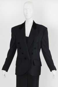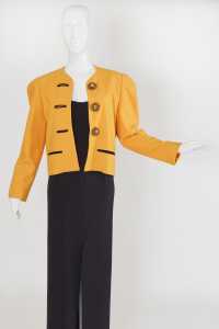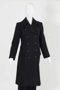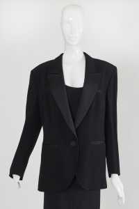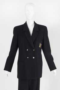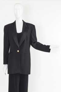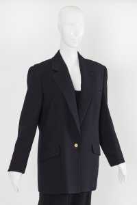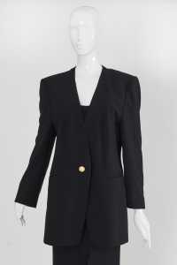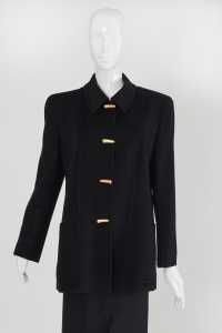 Veste-tailleur en crêpe de laine noir, bouton doré siglé.