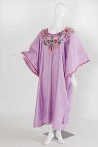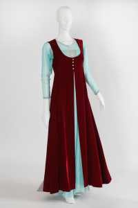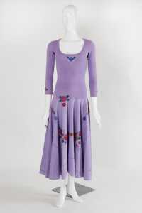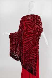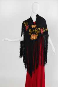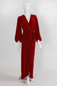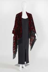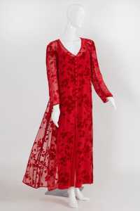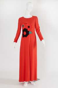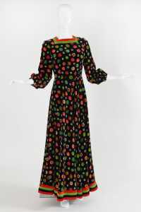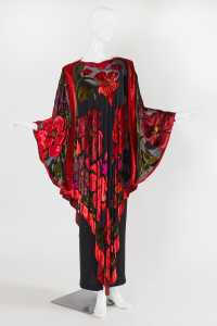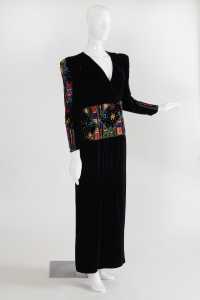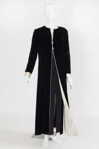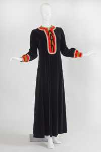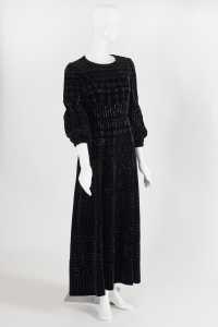 Robe longue évasée en velours de viscose noir, motif fleuri, broderies de bandes de velours unis surpiquées, cal carré, manches longues resserrées par un élastique.