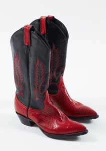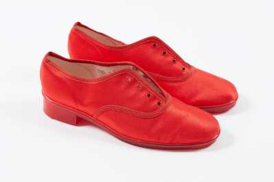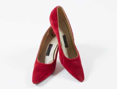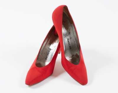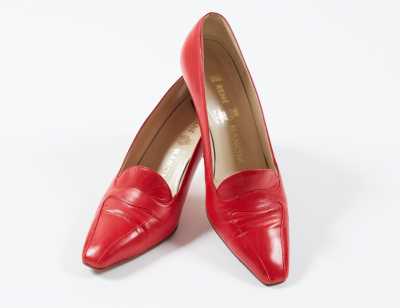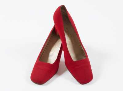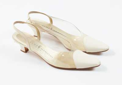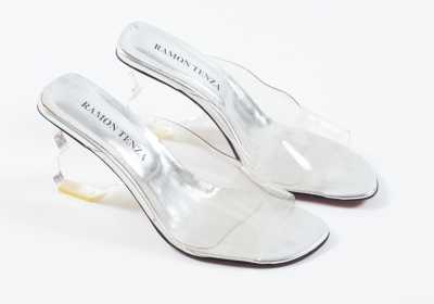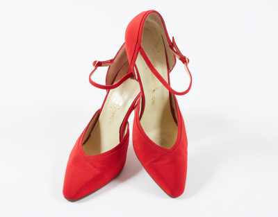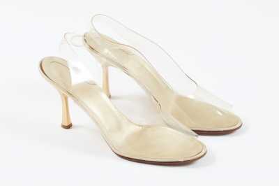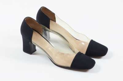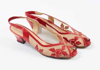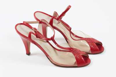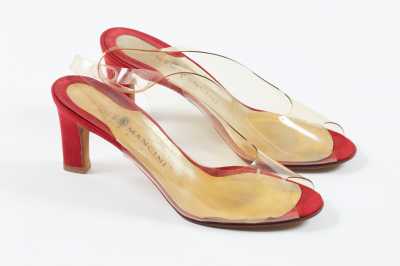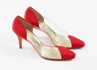 Escarpins en cuir, plastique transparent et tissu façon ottoman rouge.