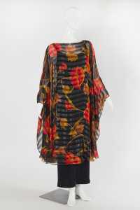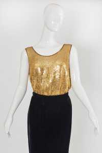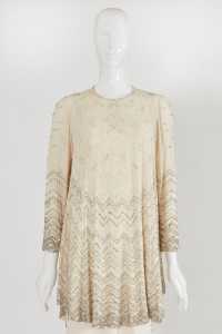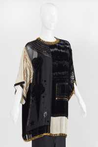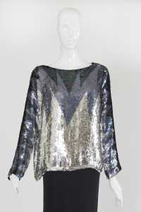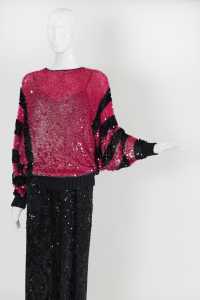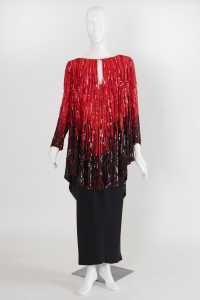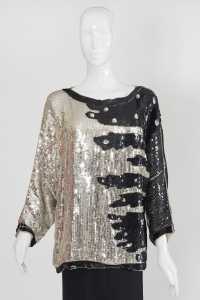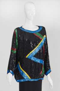 Tunique entièrement pailletée à décor de zigzags multicolores sur fond noir.