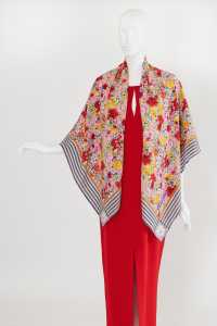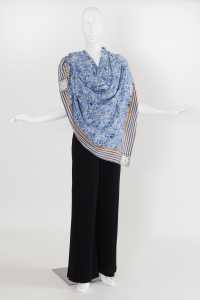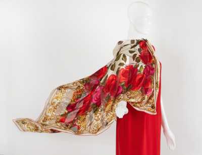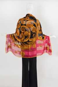 Grand carré de soie rose noir et doré, à décor de rayures et d'enroulements, 130 x 130 cm environ.