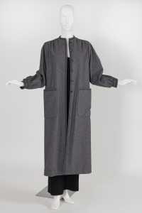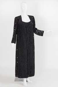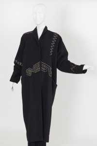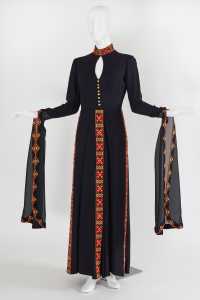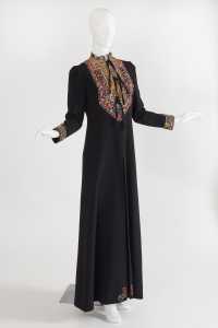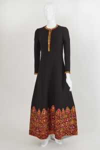 Robe longue en crêpe de laine noire brodée au fil, col tunisien.