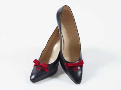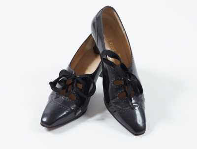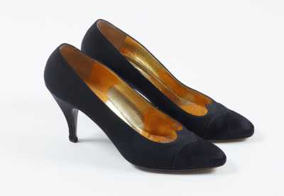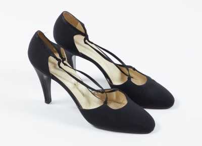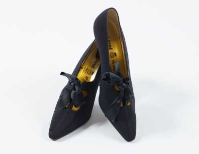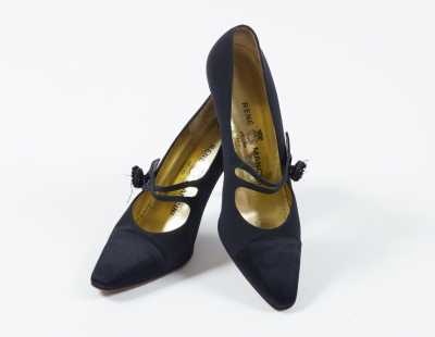 Escarpins "Marie-Jeanne" en cuir et tissu noir façon ottoman, bride en ruban noir.