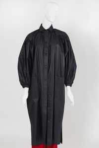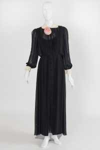 Robe longue noire en crêpe, broderie au fil, manches droites prolongées de mousseline, col Mao brodé, boutons dorés.