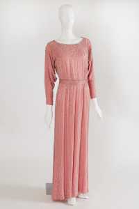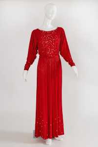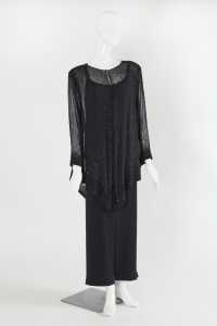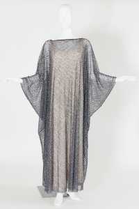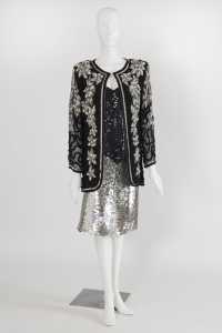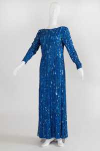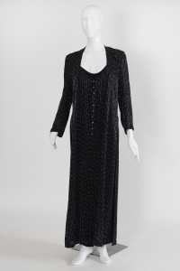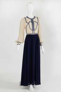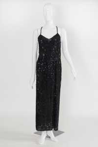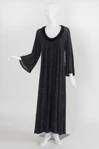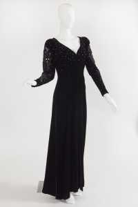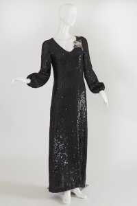 Robe longue en tissu pailleté noir, fleurs en paillettes et strass beige et bleutés, large col en V, manches resserrées par un élastique.