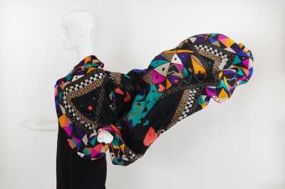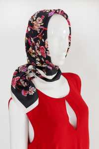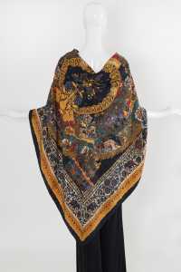 Grand carré de soie à décor style Perse sur fond noir, 140 x 140 cm environ.