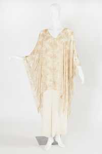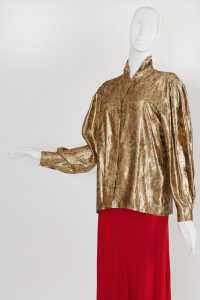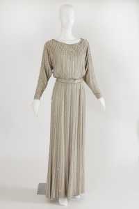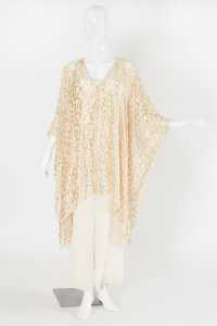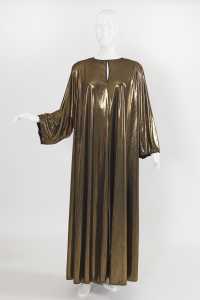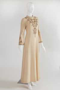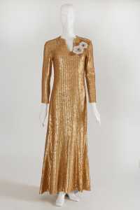 Robe longue évasée en tissu pailleté doré, col tunisien, fleurs en paillettes et strass, manches droites fermées par un zip.