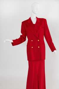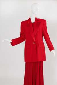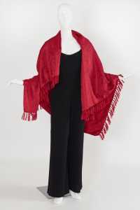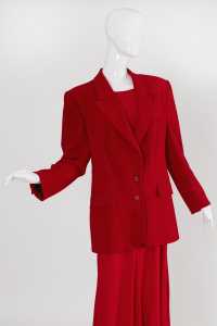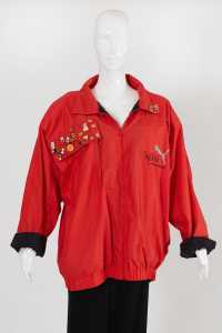 Blouson en toile rouge imperméabilisée, annoté "Nana citoyenne du monde", à l'intérieur la reproduction du portrait de l'artiste. Agrémenté de pins et de broches par Nana Mouskouri.