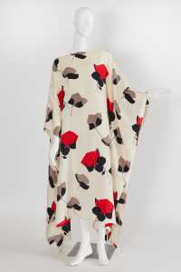 Robe évasée en toile beige, grands motifs polylobés orange, col rond, poignets et taille surlignés d'une bordure noire