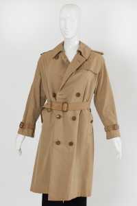 Trench mi-long croisé, en gabardine beige foncé, pattes d'épaule, ceinture.