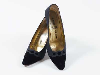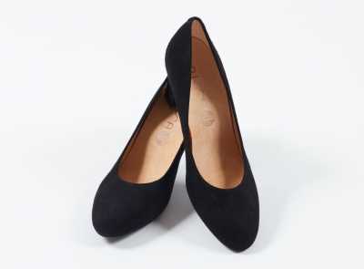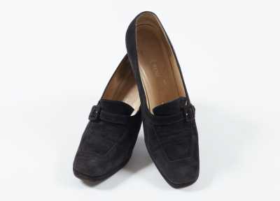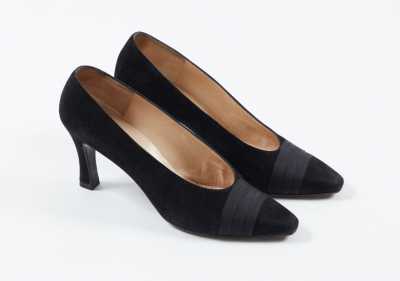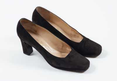 Escarpins à bouts carré et à boucle, en cuir et daim noir.
